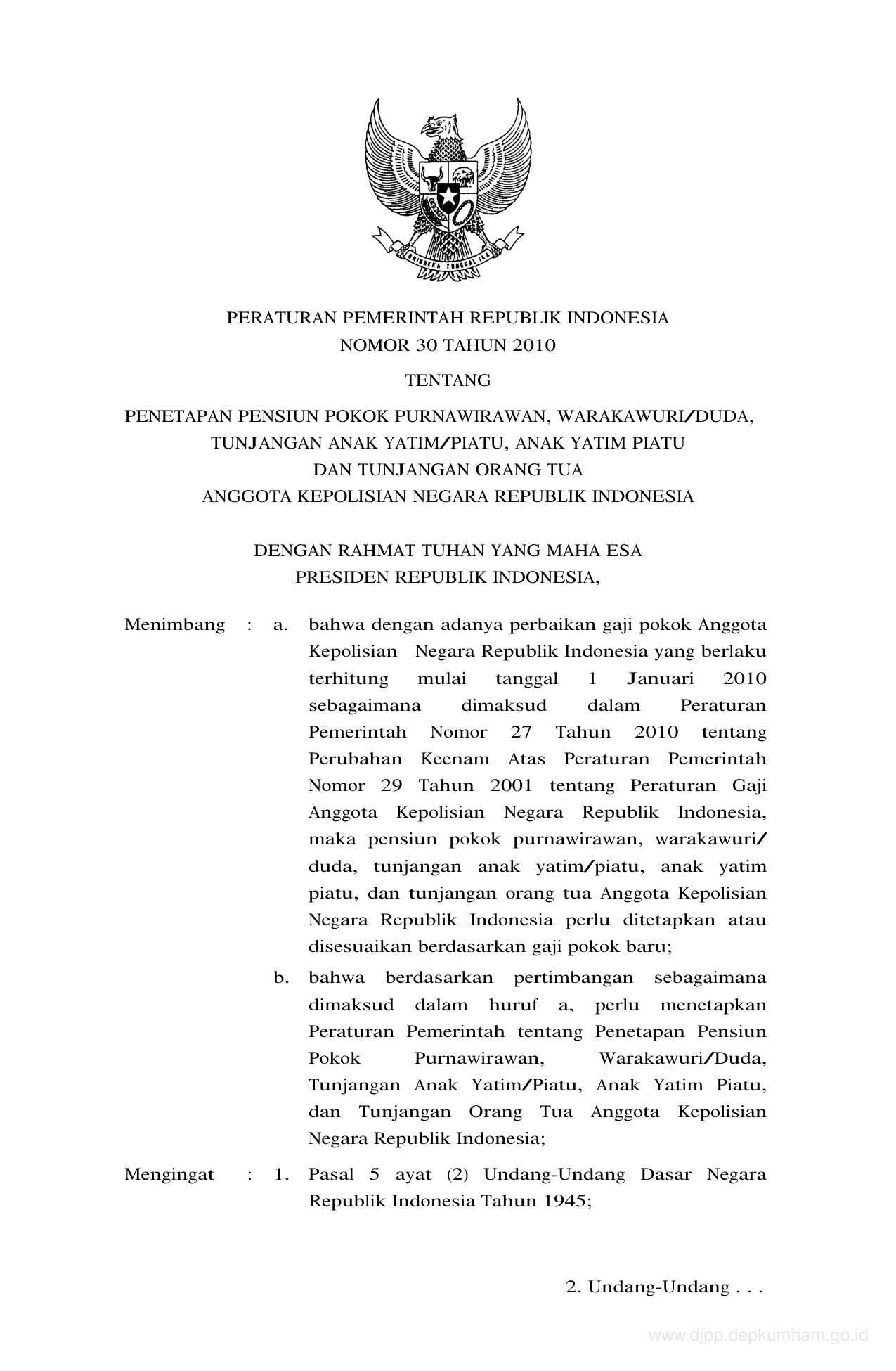 PP Nomor 30 Tahun 2010 | Peraturan Pemerintah Nomor 30 Tahun 2010 tentang PENETAPAN PENSIUN POKOK PURNAWIRAWAN, WARAKAWURI/DUDA, TUNJANGAN ANAK YATIM PIATU, ANAK YATIM PIATU, DAN TUNJANGAN ORANG TUA ANGGOTA KEPOLISIAN RI