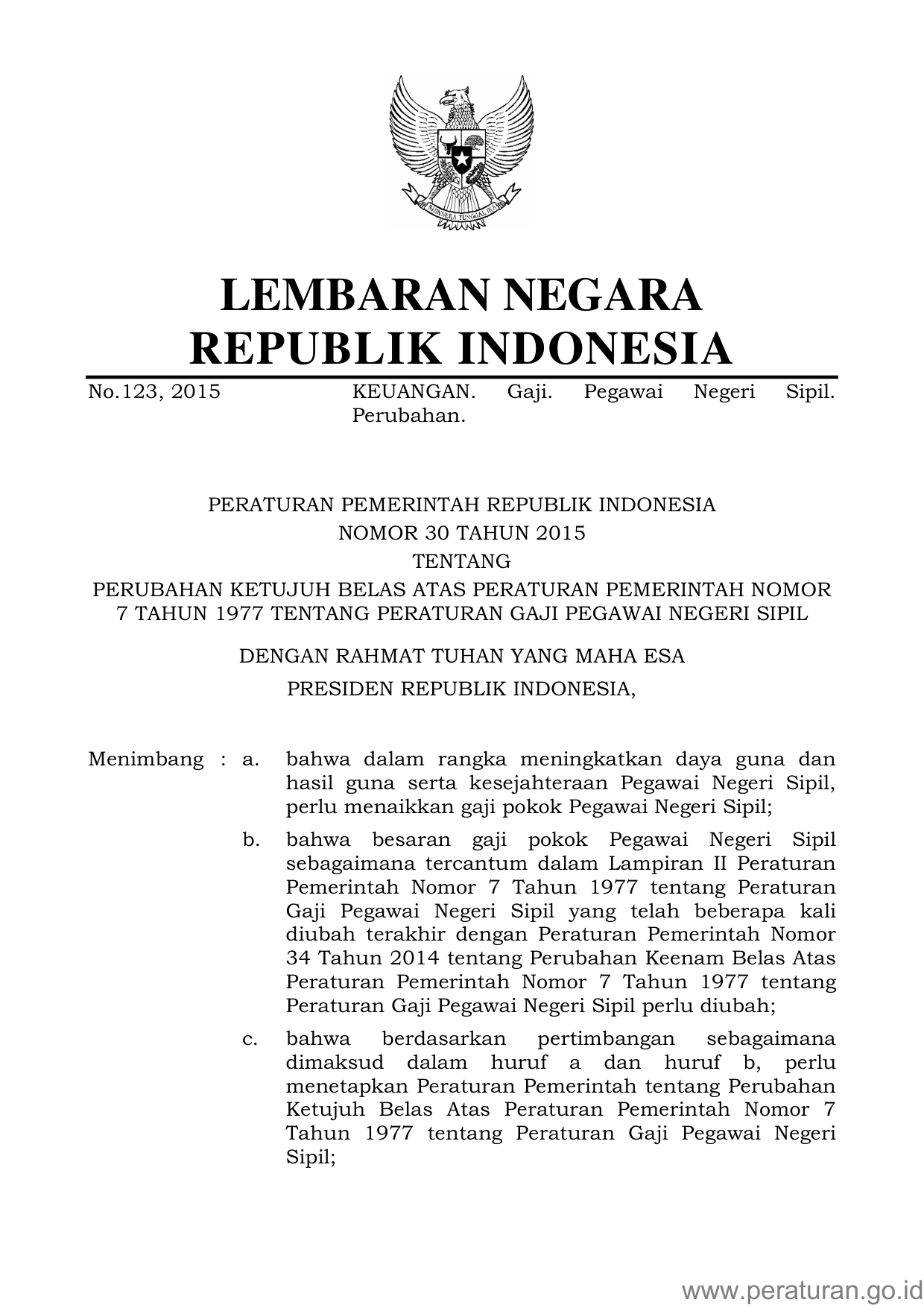PP Nomor 30 Tahun 2015 | Peraturan Pemerintah Nomor 30 Tahun 2015 tentang PERUBAHAN KETUJUH BELAS ATAS PERATURAN PEMERINTAH NOMOR 7 TAHUN 1977 TENTANG PERATURAN GAJI PEGAWAI NEGERI SIPIL