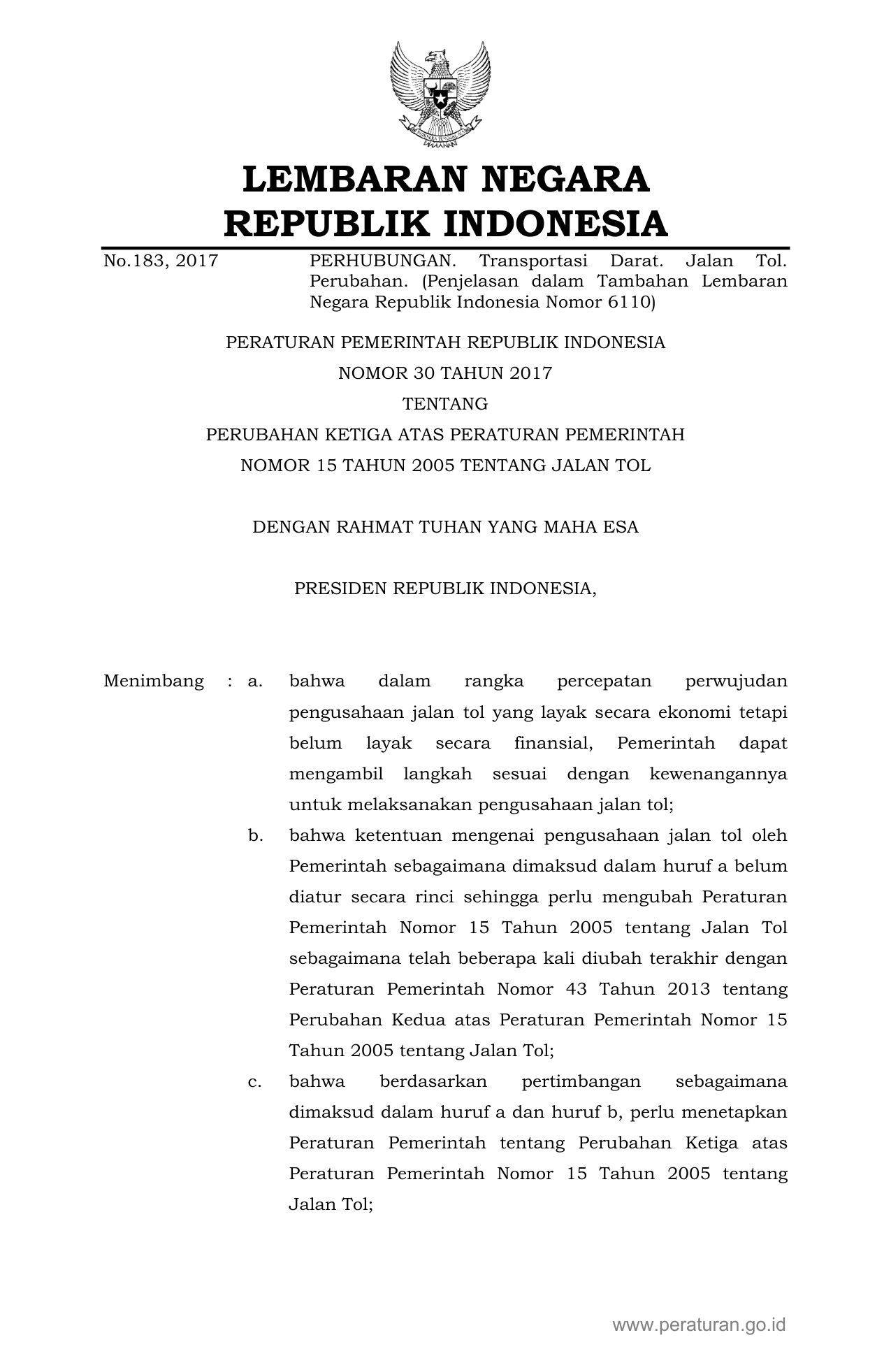 PP Nomor 30 Tahun 2017 | Peraturan Pemerintah Nomor 30 Tahun 2017 tentang Perubahan Ketiga Atas Peraturan Pemerintah Nomor 15 Tahun 2005 tentang Jalan Tol