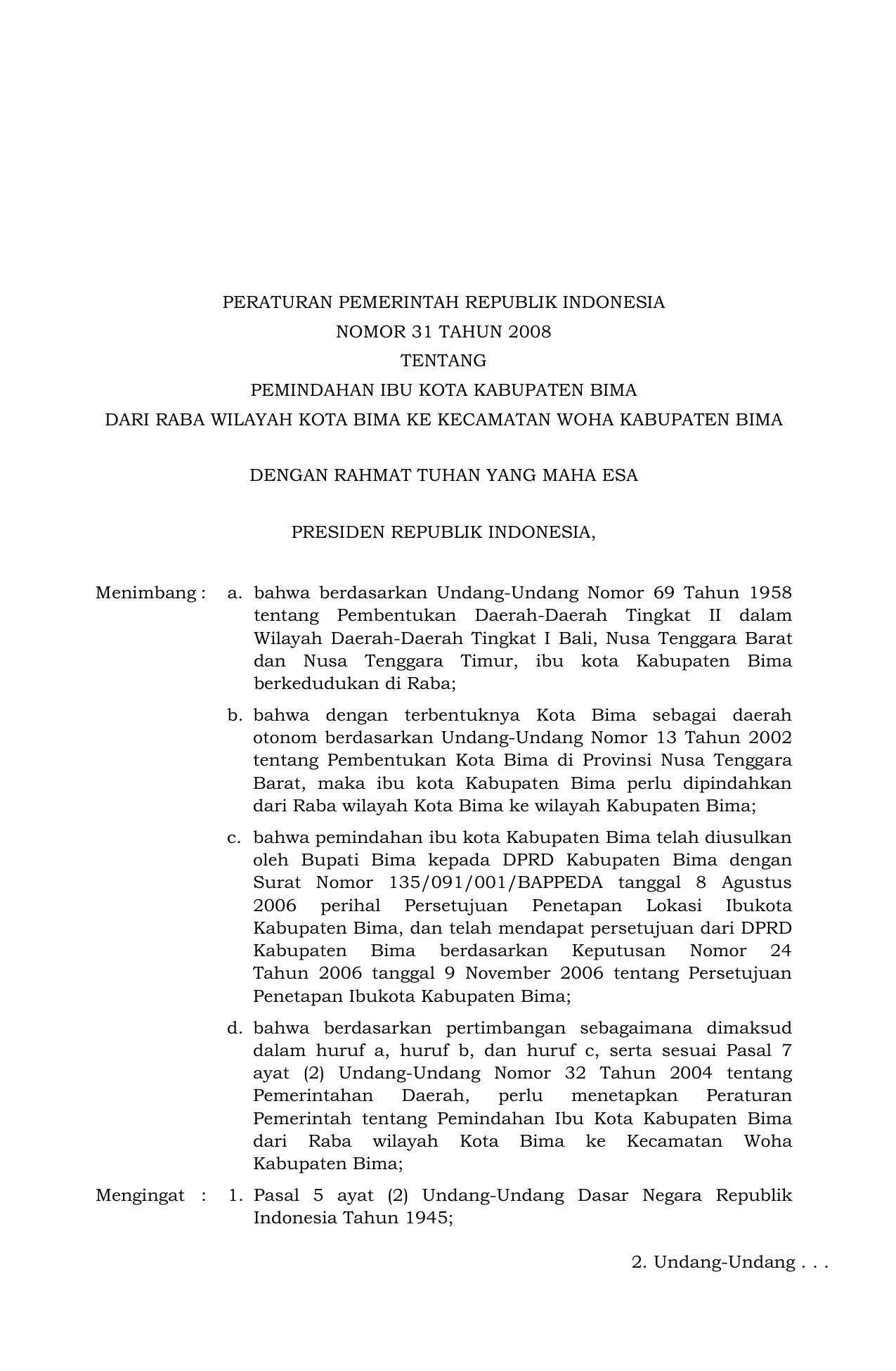 PP Nomor 31 Tahun 2008 | Peraturan Pemerintah Nomor 31 Tahun 2008 tentang PEMINDAHAN IBUKOTA KABUPATEN BIMA DARI RABA WILAYAH KOTA BIMA KE KECAMATAN WOHA KABUPATEN BIMA