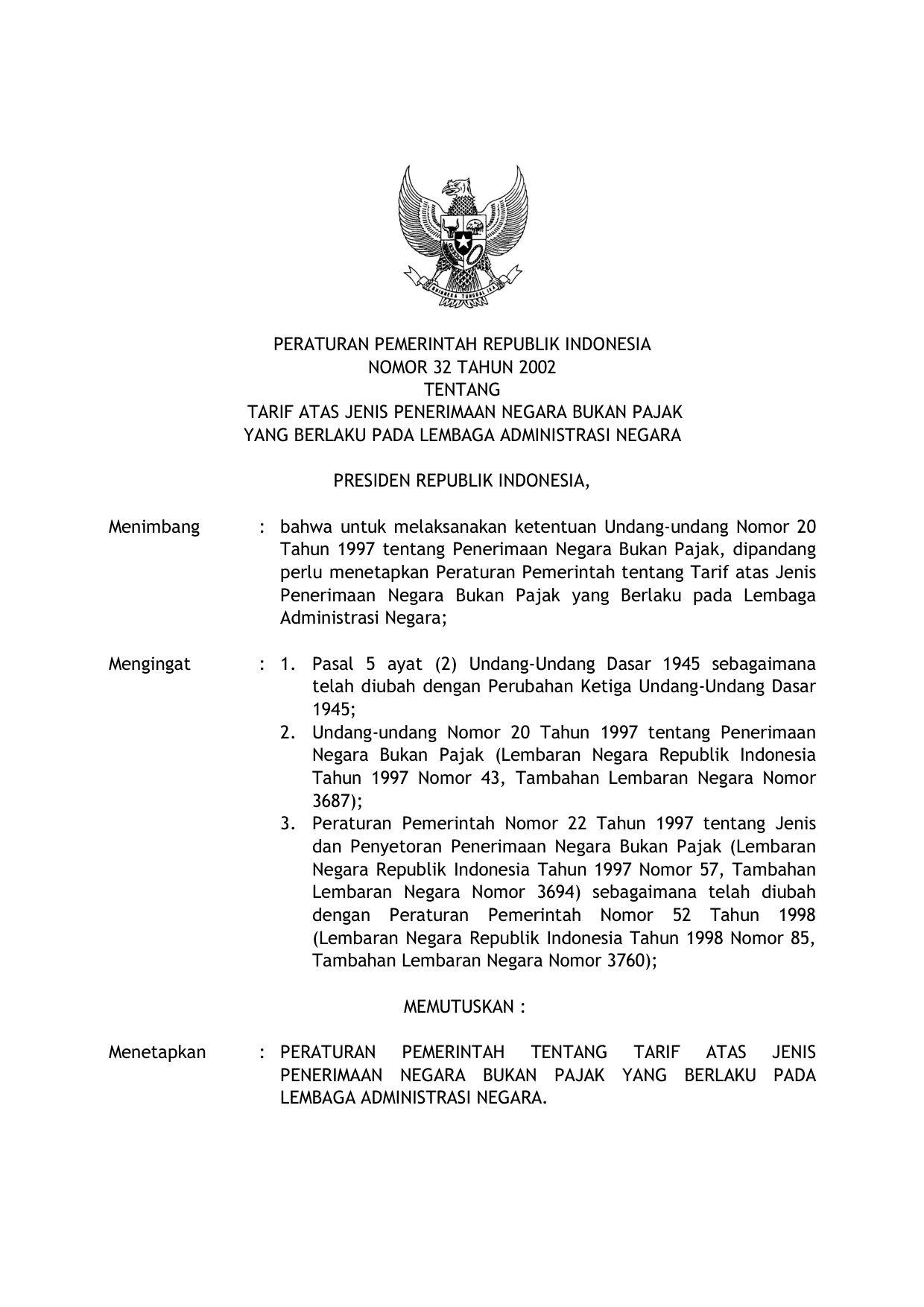 PP Nomor 32 Tahun 2002 | Peraturan Pemerintah Nomor 32 Tahun 2002 tentang TARIF ATAS JENIS PENERIMAAN NEGARA BUKAN PAJAK YANG BERLAKU PADA LEMBAGA ADMINISTRASI NEGARA