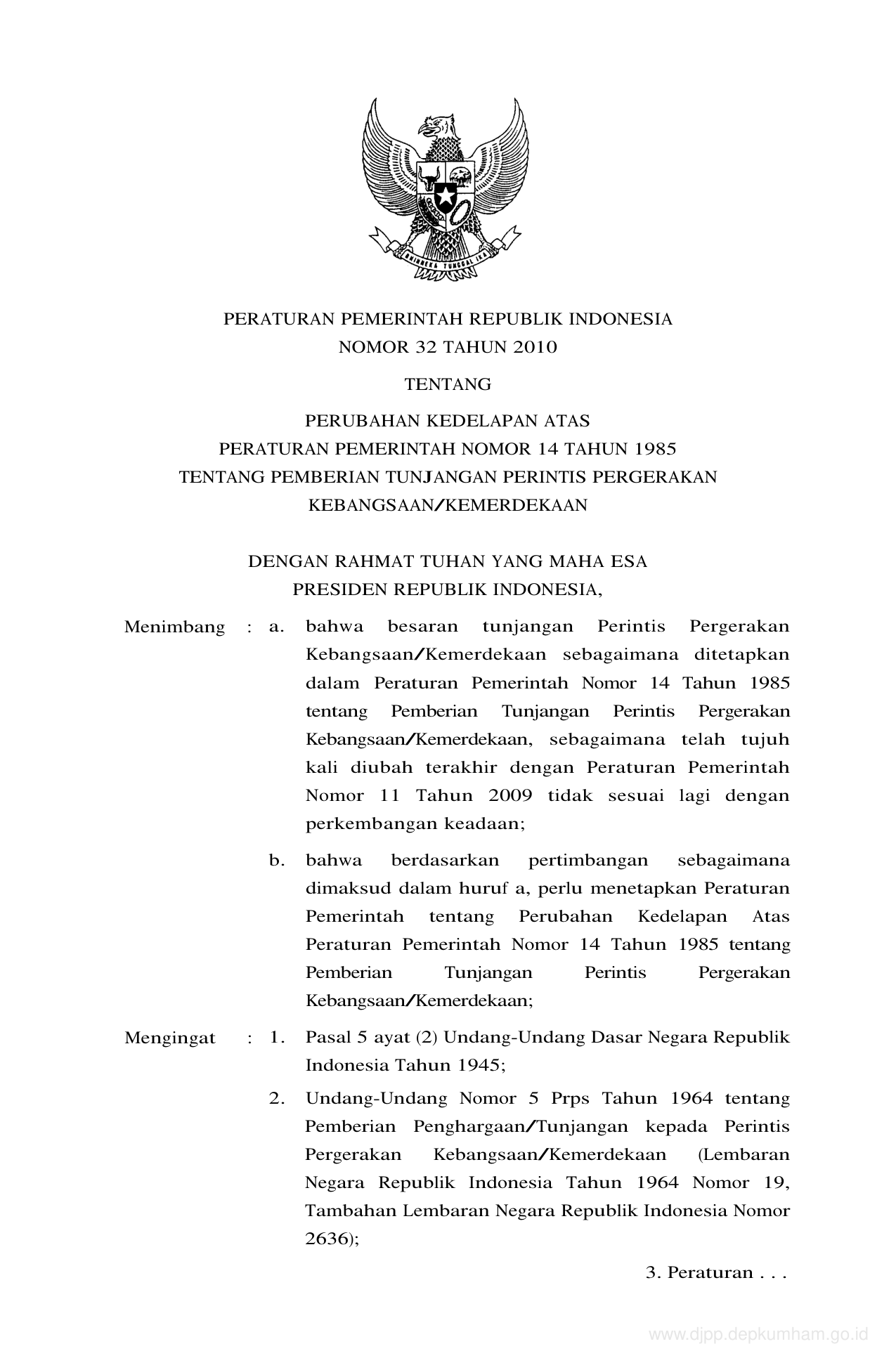 PP Nomor 32 Tahun 2010 | Peraturan Pemerintah Nomor 32 Tahun 2010 tentang PERUBAHAN KEDELAPAN ATAS PERATURAN PEMERINTAH NOMOR 14 TAHUN 1985 TENTANG PEMBERIAN TUNJANGAN PERINTIS PERGERAKAN KEBANGSAAN/KEMERDEKAAN