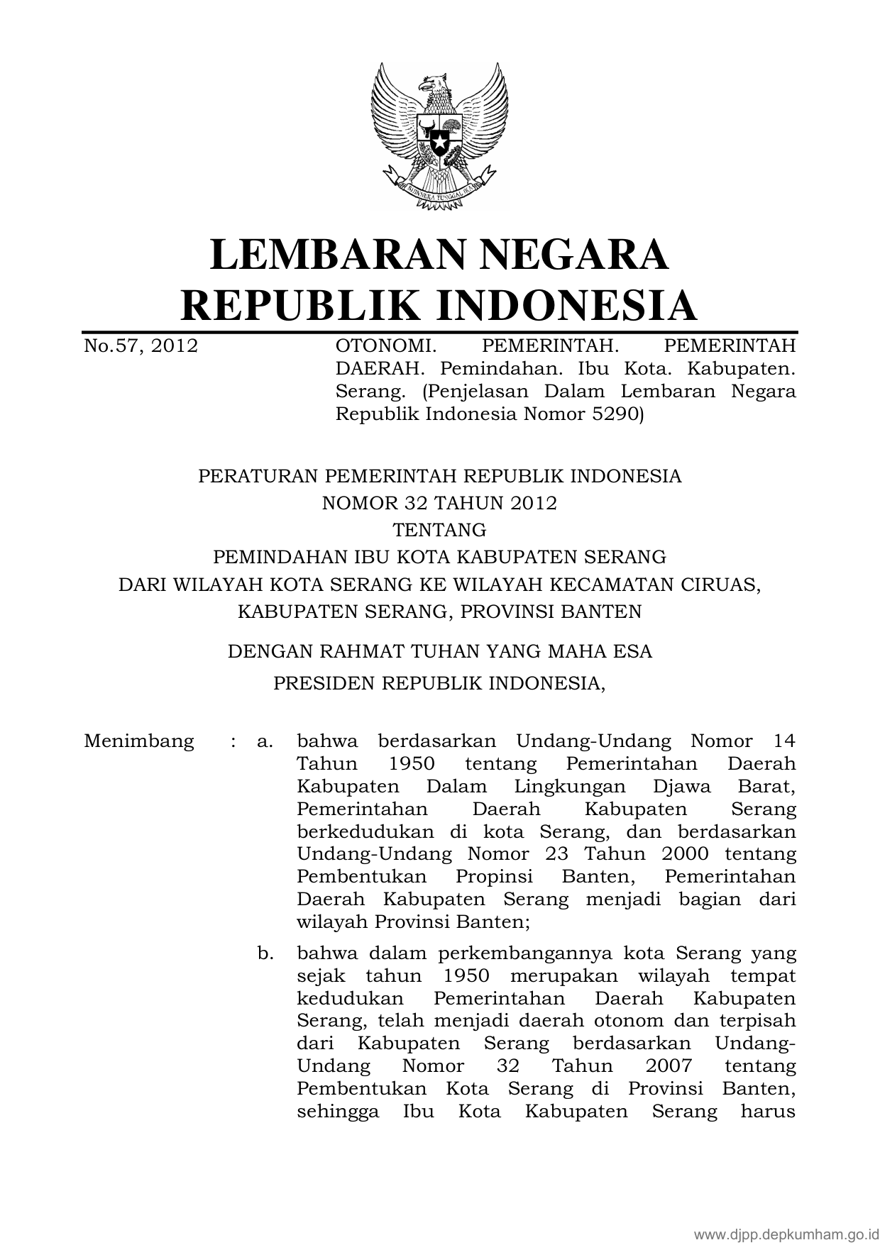 PP Nomor 32 Tahun 2012 | Peraturan Pemerintah Nomor 32 Tahun 2012 tentang PEMINDAHAN IBUKOTA KABUPATEN SERANG DARI WILAYAH KOTA SERANG KE WILAYAH KECAMATAN CIRUAS, KABUPATEN SERANG, PROVINSI BANTEN