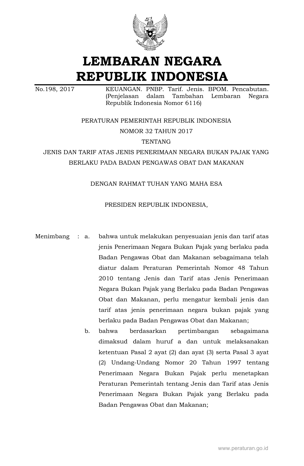 PP Nomor 32 Tahun 2017 | Peraturan Pemerintah Nomor 32 Tahun 2017 tentang Jenis dan Tarif Atas Jenis Penerimaan Negara Bukan Pajak yang Berlaku pada Badan Pengawas Obat dan Makanan