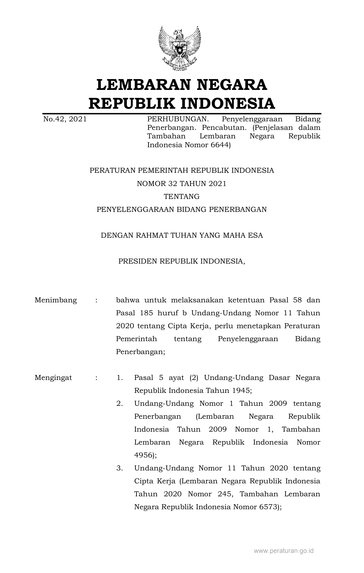 PP Nomor 32 Tahun 2021 | Peraturan Pemerintah Nomor 32 Tahun 2021 tentang PENYELENGGARAAN BIDANG PENERBANGAN