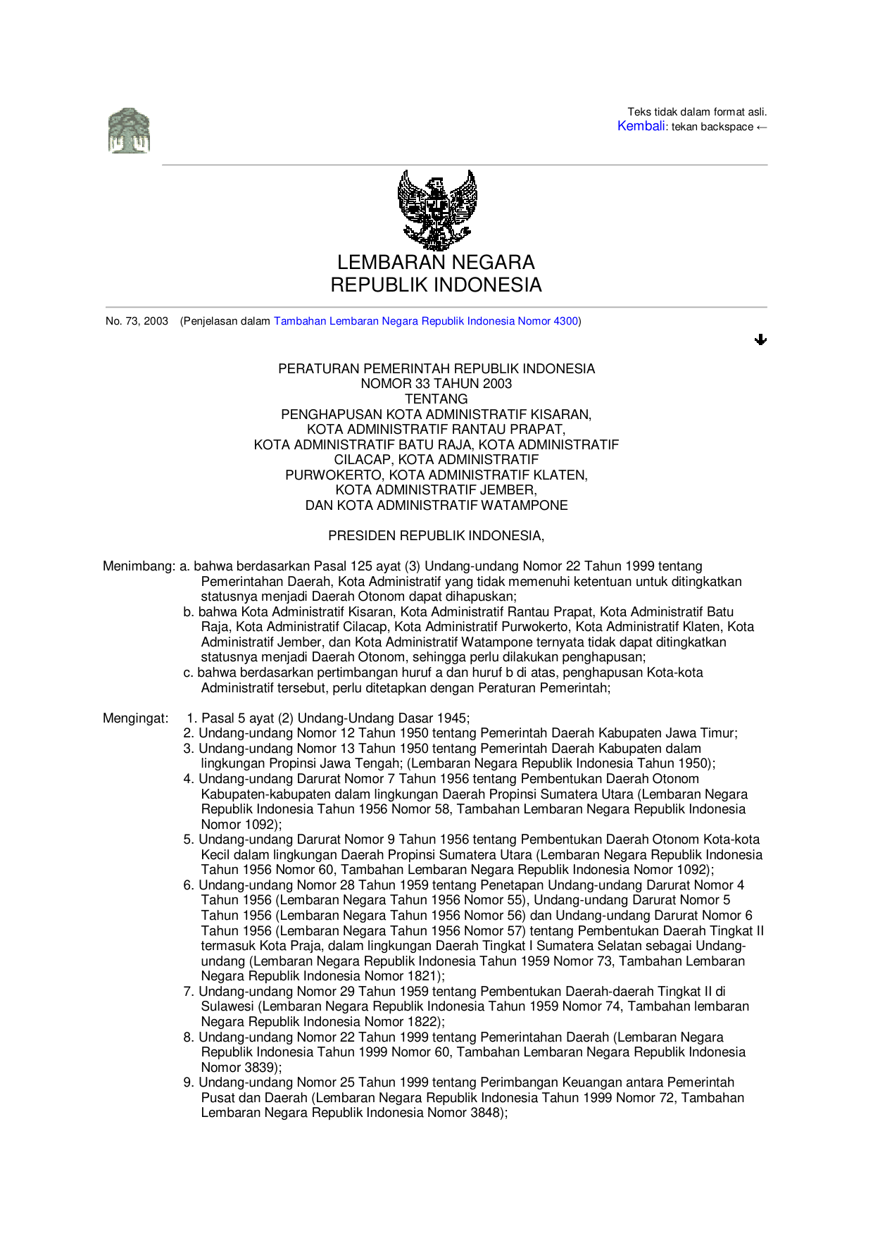 PP Nomor 33 Tahun 2003 | Peraturan Pemerintah Nomor 33 Tahun 2003 tentang PENGHAPUSAN KOTA ADMINISTRATIF KISARAN, KOTA ADMINISTRATIF RANTAU PRAPAT, KOTA ADMINISTRATIF BATU RAJA, KOTA ADMINISTRATIF CILACAP, KOTA ADMINISTRATIF PURWOKERTO, KOTA ADMINISTRATIF KLATEN, KOTA ADMINISTRATIF JEMBER, DAN KOTA ADMINISTRATIF WATAMPONE