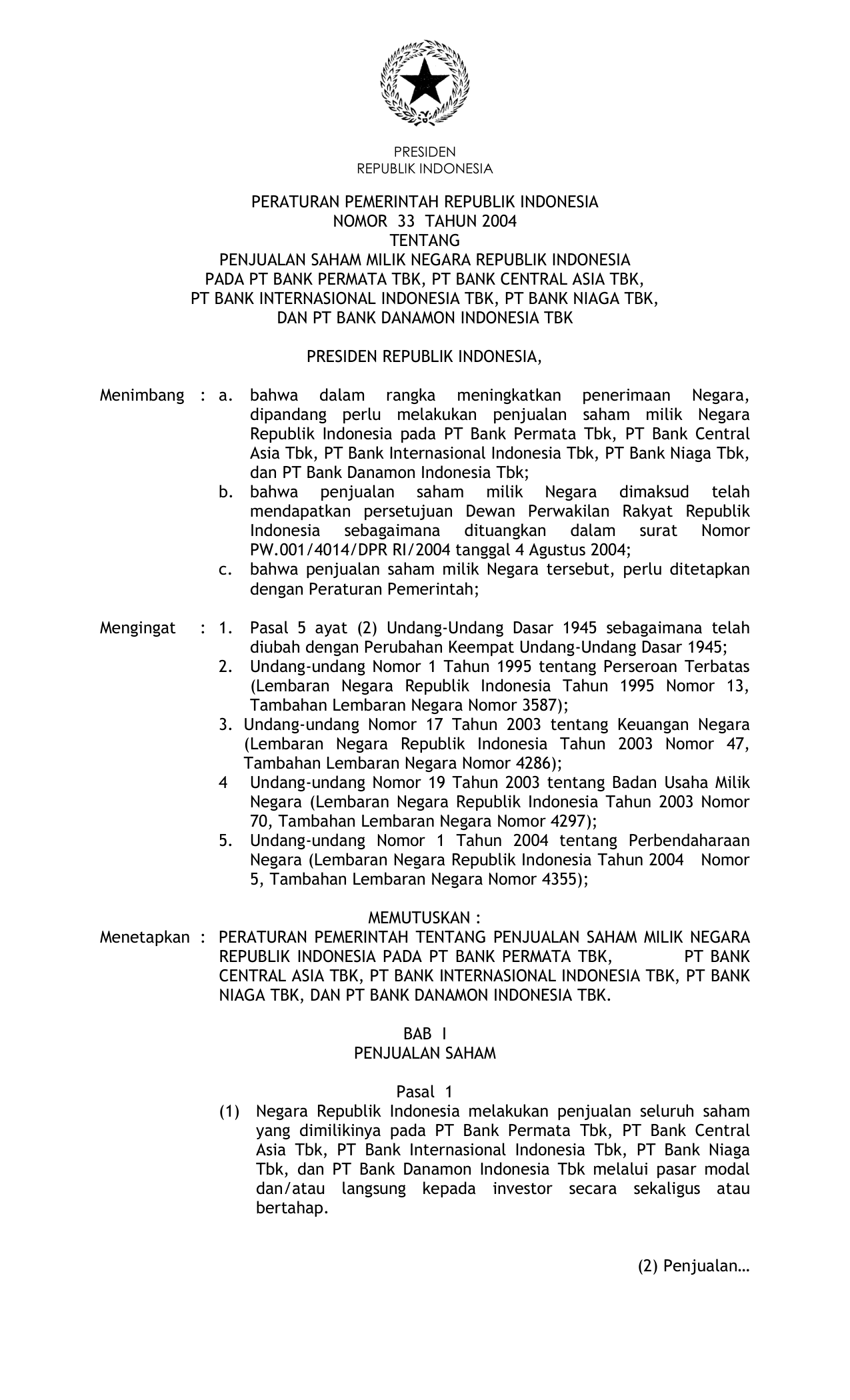 PP Nomor 33 Tahun 2004 | Peraturan Pemerintah Nomor 33 Tahun 2004 tentang PENJUALAN SAHAM MILIK NEGARA RI PADA PT BANK PERMATA TBK, PT BANK CENTRAL ASIA TBK, PT BANK INTERNASIONAL INDONESIA TBK, PT BANK NIAGA TBK, DAN PT BANK DANAMON INDONESIA TBK