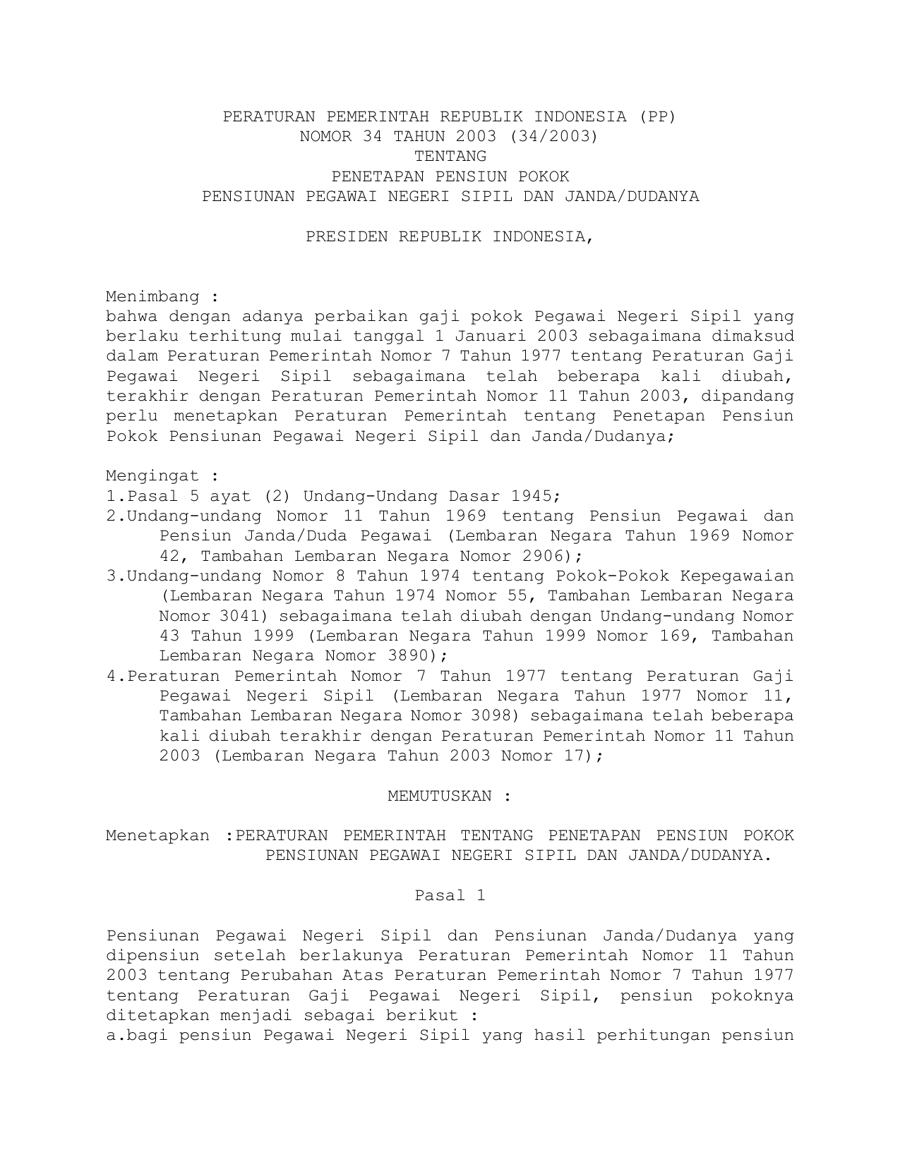 PP Nomor 34 Tahun 2003 | Peraturan Pemerintah Nomor 34 Tahun 2003 tentang PENETAPAN PENSIUN POKOK PENSIUNAN PEGAWAI NEGERI SIPIL DAN JANDA/DUDANYA