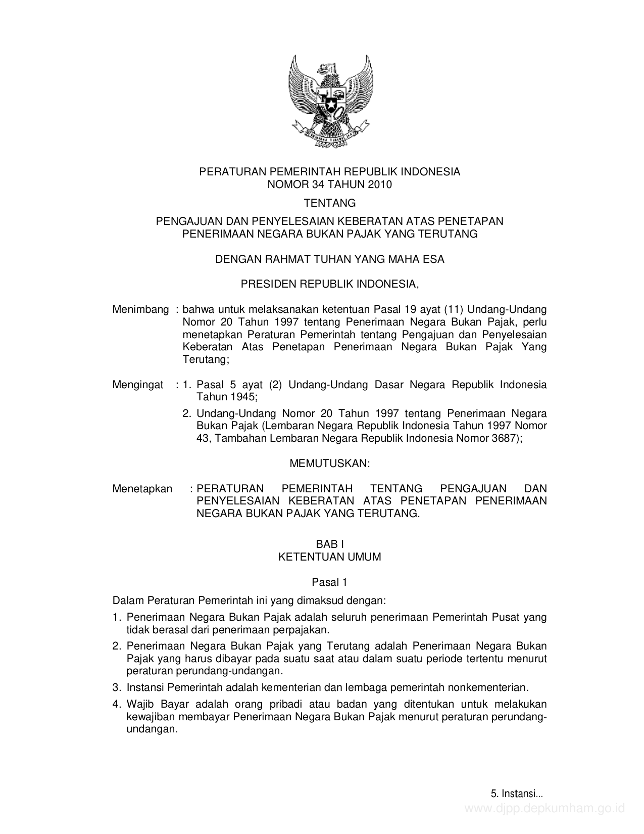 PP Nomor 34 Tahun 2010 | Peraturan Pemerintah Nomor 34 Tahun 2010 tentang PENGAJUAN PENYELESAIAN KEBERATAN ATAS PENETAPAN PENERIMAAN NEGARA BUKAN PAJAK YANG TERHUTANG