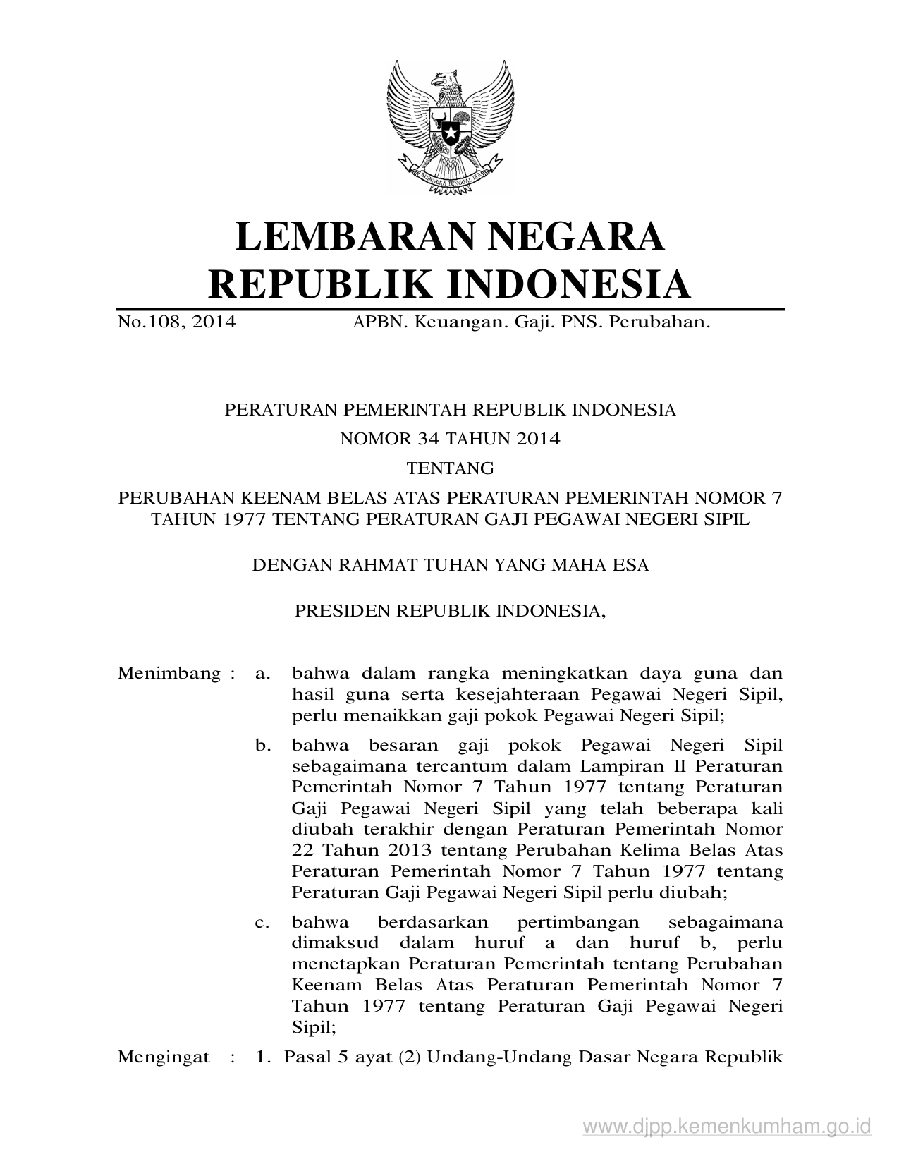 PP Nomor 34 Tahun 2014 | Peraturan Pemerintah Nomor 34 Tahun 2014 tentang PERUBAHAN KEENAM BELAS ATAS PERATURAN PEMERINTAH NOMOR 7 TAHUN 1977 TENTANG PERATURAN GAJI PEGAWAI NEGERI SIPIL