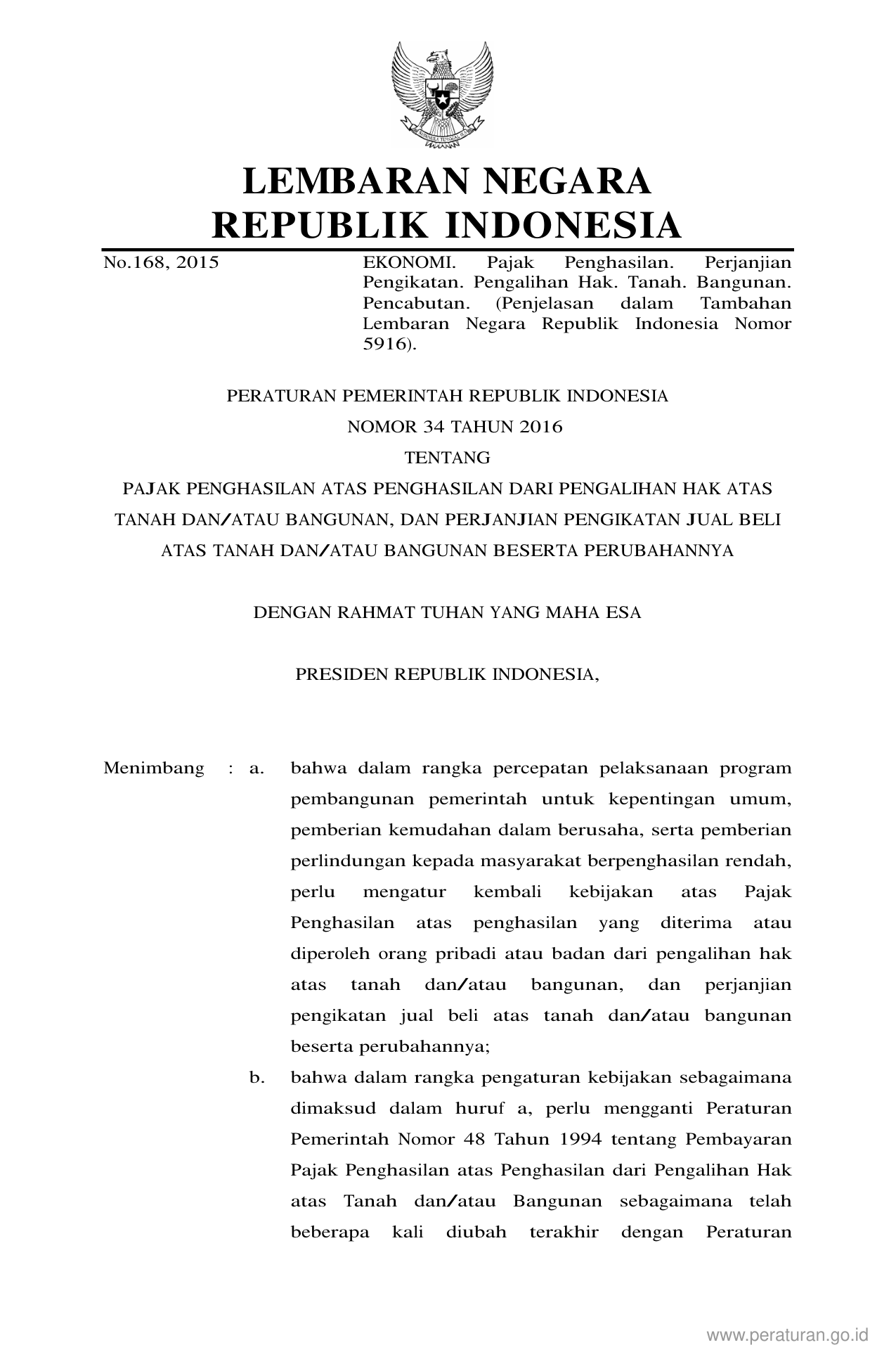PP Nomor 34 Tahun 2016 | Peraturan Pemerintah Nomor 34 Tahun 2016 tentang PAJAK PENGHASILAN ATAS PENGHASILAN DARI PENGALIHAN HAK ATAS TANAH DANATAU BANGUNAN DAN PERJANJIAN PENGIKATAN JUAL BELI ATAS TANAH DANATAU BANGUNAN BESERTA PERUBAHANNYA