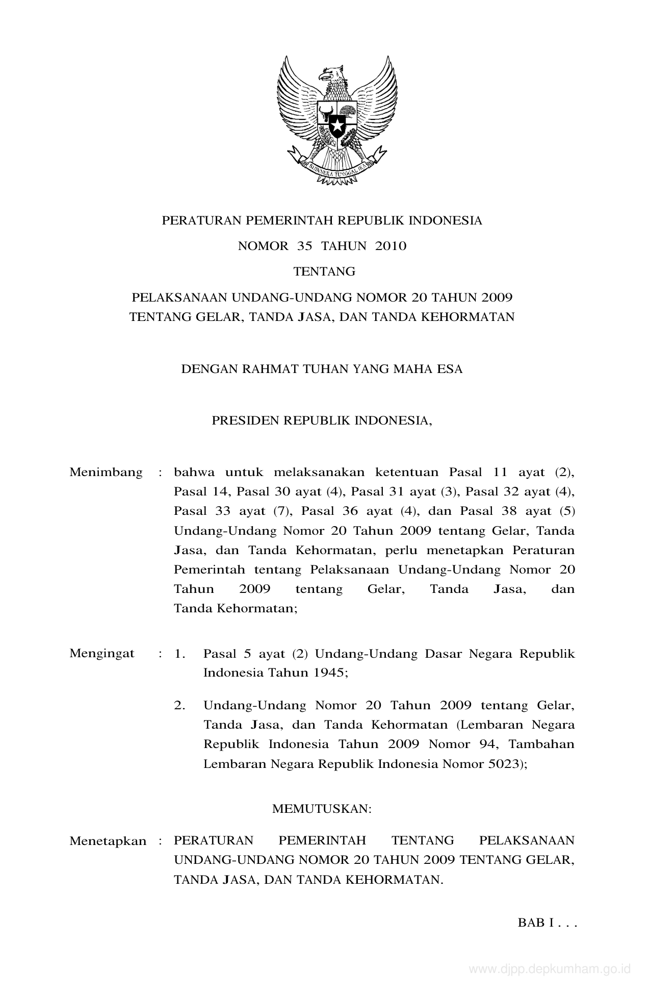 PP Nomor 35 Tahun 2010 | Peraturan Pemerintah Nomor 35 Tahun 2010 tentang PELAKSANAAN UNDANG-UNDANG NOMOR 20 TAHUN 2009 TENTANG PENERIMAAN GELAR, TANDA JASA, DAN TANDA KEHORMATAN