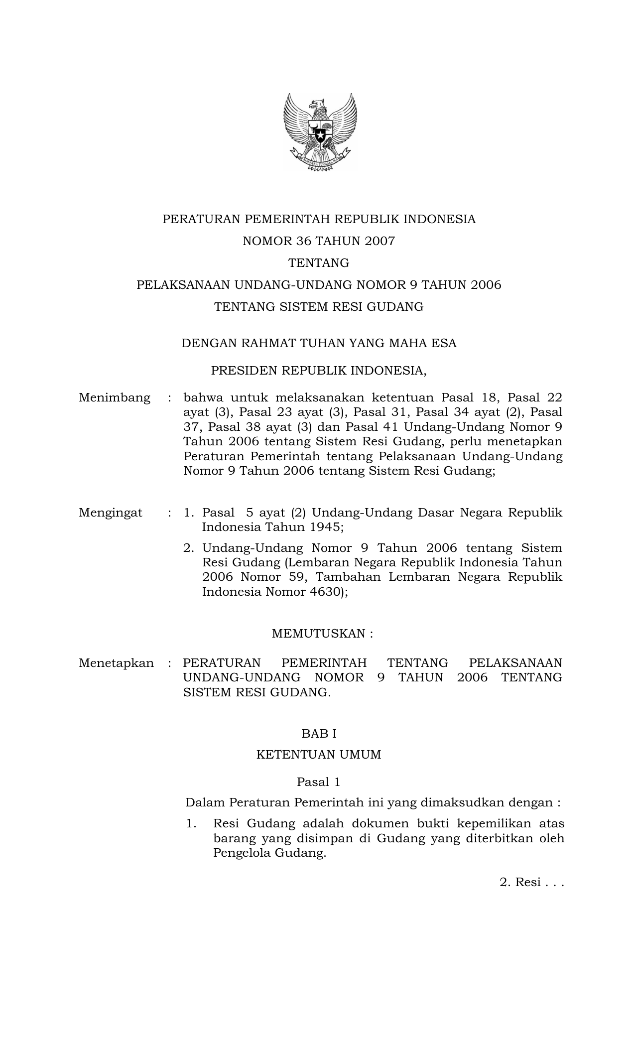 PP Nomor 36 Tahun 2007 | Peraturan Pemerintah Nomor 36 Tahun 2007 tentang PELAKSANAAN UU 9-2006 TENTANG SISTEM RESI GUDANG