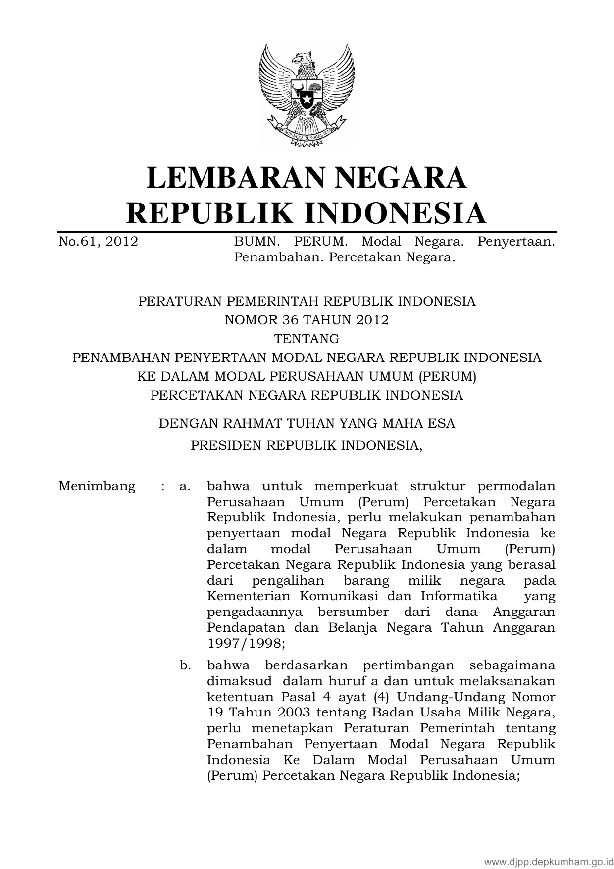 PP Nomor 36 Tahun 2012 | Peraturan Pemerintah Nomor 36 Tahun 2012 tentang PENAMBAHAN PENYERTAAN MODAL NEGARA REPUBLIK INDONESIA KE DALAM MODAL PERUSAHAAN UMUM (PERUM) PERCETAKAN NEGARA REPUBLIK INDONESIA