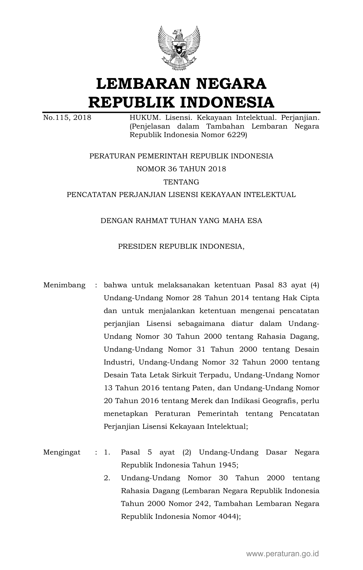 PP Nomor 36 Tahun 2018 | Peraturan Pemerintah Nomor 36 Tahun 2018 tentang Pencatatan Perjanjian Lisensi Kekayaan Intelektual