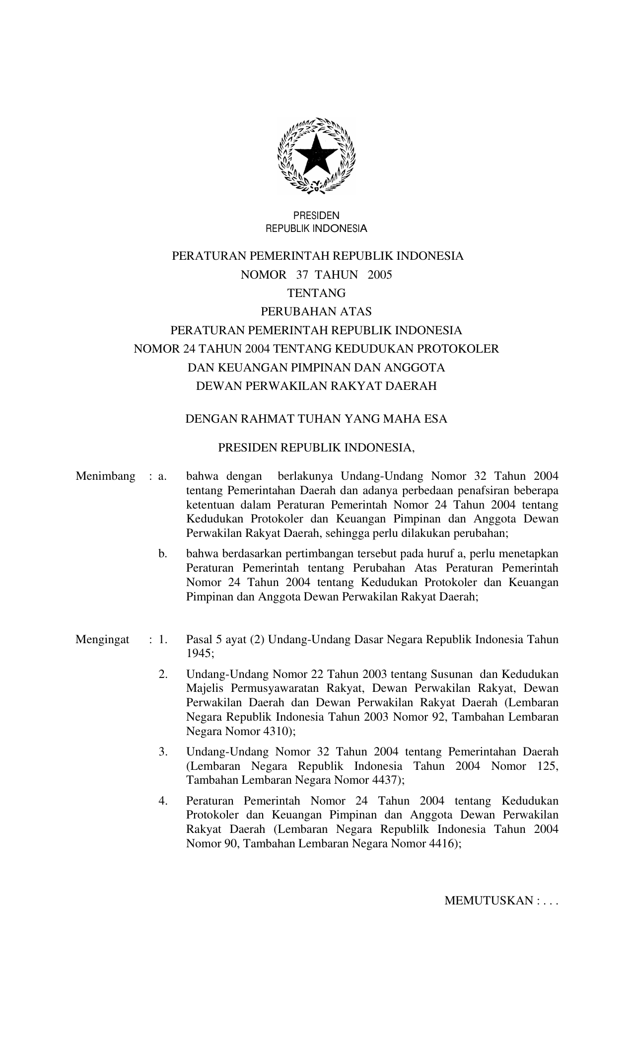 PP Nomor 37 Tahun 2005 | Peraturan Pemerintah Nomor 37 Tahun 2005 tentang PERUBAHAN PP 24-2004 TENTANG KEDUDUKAN PROTOKOLER DAN KEUANGAN PIMPINAN DAN ANGGOTA DEWAN PERWAKILAN RAKYAT DAERAH