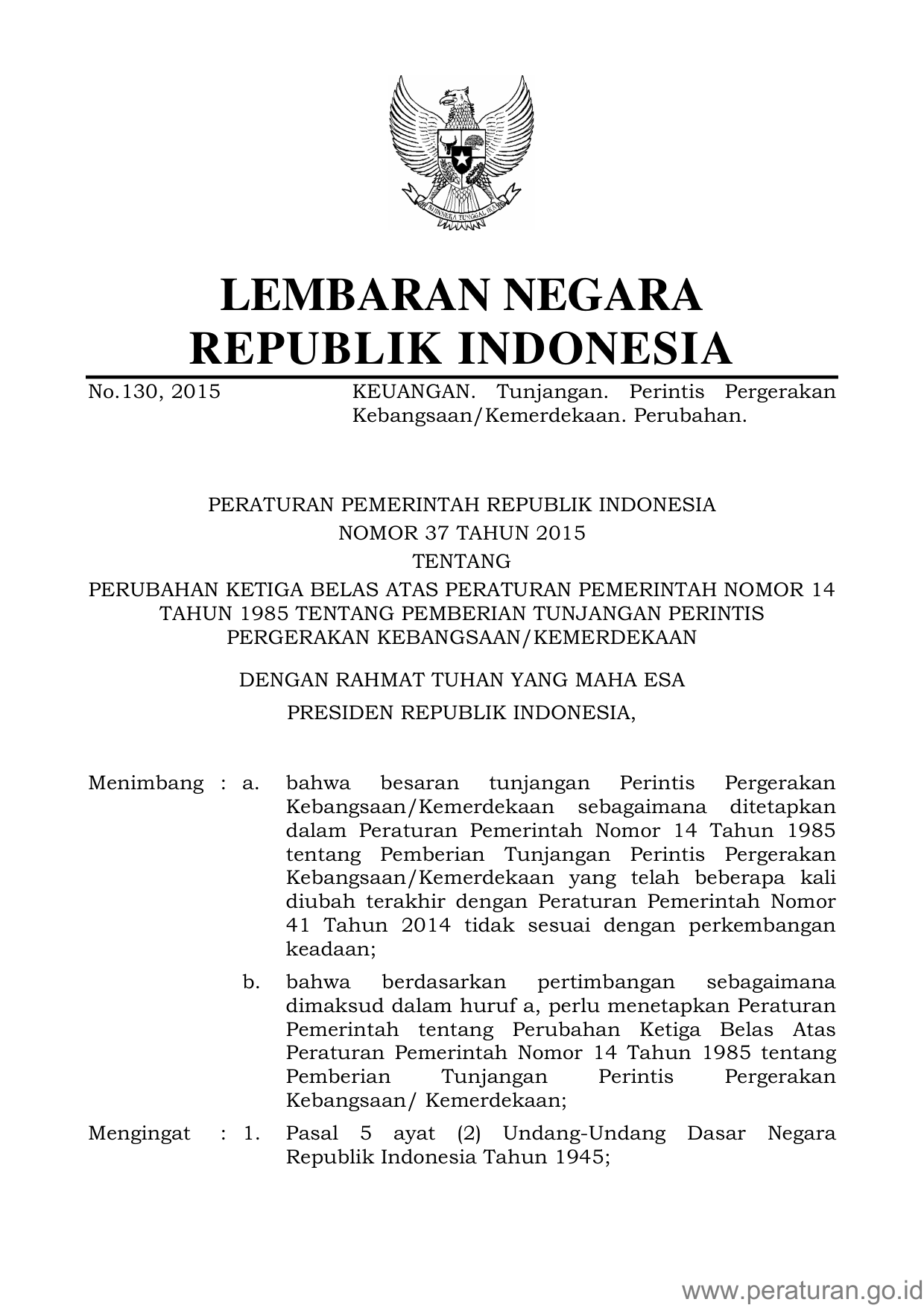 PP Nomor 37 Tahun 2015 | Peraturan Pemerintah Nomor 37 Tahun 2015 tentang PERUBAHAN KETIGA BELAS ATAS PERATURAN PEMERINTAH NOMOR 14 TAHUN 1985 TENTANG PEMBERIAN TUNJANGAN PERINTIS PERGERAKAN KEBANGSAAN/KEMERDEKAAN