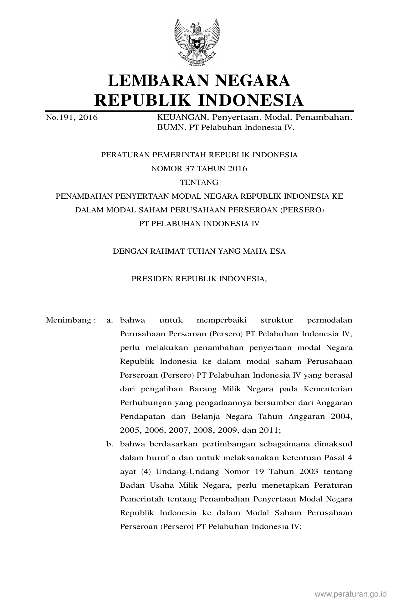 PP Nomor 37 Tahun 2016 | Peraturan Pemerintah Nomor 37 Tahun 2016 tentang PENAMBAHAN PENYERTAAN MODAL NEGARA REPUBLIK INDONESIA KE DALAM MODAL SAHAM PERUSAHAAN PERSEROAN PERSERO PT PELABUHAN INDONESIA IV