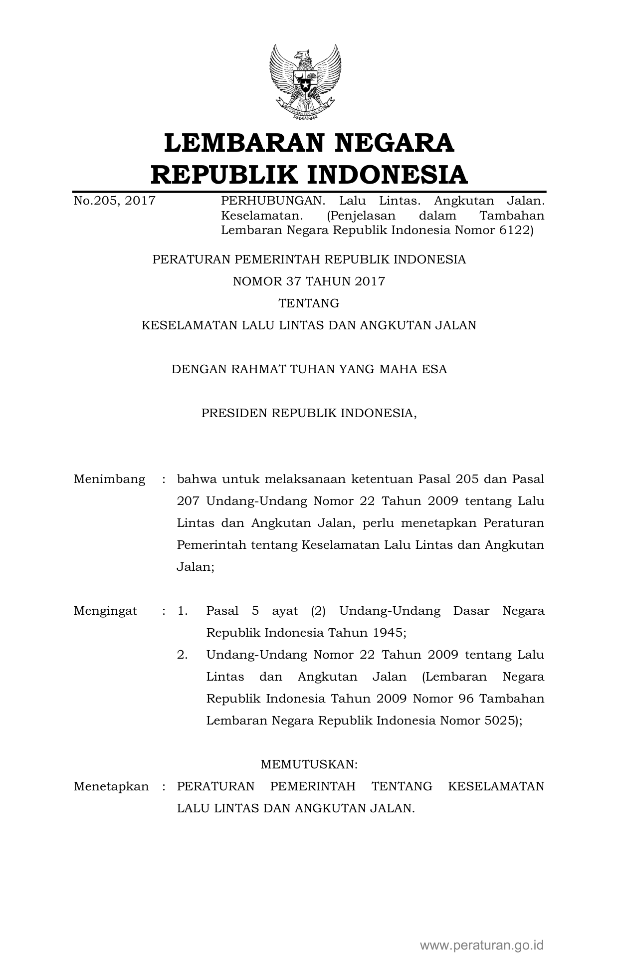 PP Nomor 37 Tahun 2017 | Peraturan Pemerintah Nomor 37 Tahun 2017 tentang Keselamatan Lalu Lintas Dan Angkutan Jalan