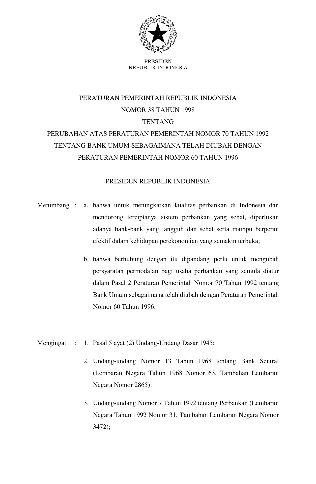 PP Nomor 38 Tahun 1998 | Peraturan Pemerintah Nomor 38 Tahun 1998 tentang PERUBAHAN PP 70-1992 TENTANG BANK UMUM SEBAGAIMANA TELAH DIUBAH DENGAN PP 60-996
