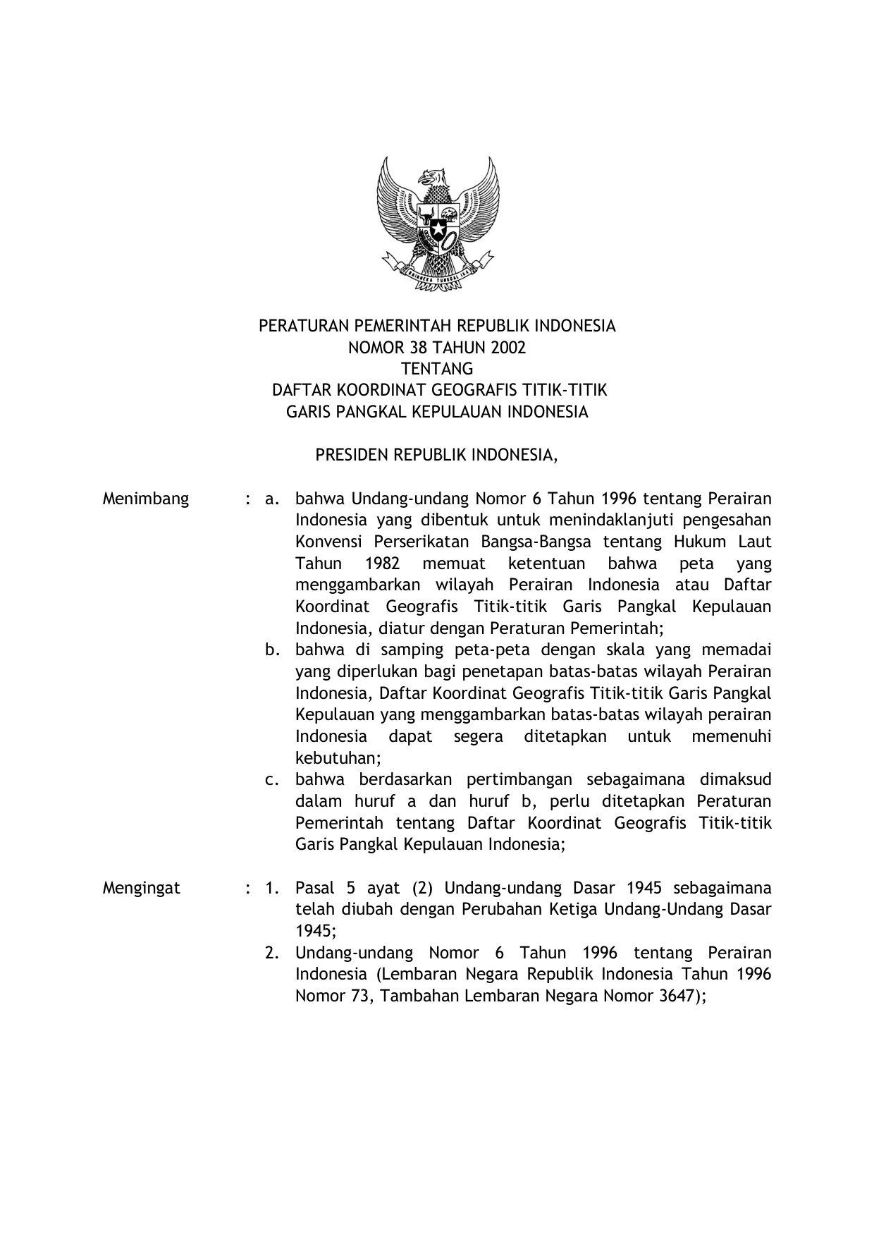 PP Nomor 38 Tahun 2002 | Peraturan Pemerintah Nomor 38 Tahun 2002 tentang DAFTAR KOORDINAT GEOGRAFIS TITIK-TITIK GARIS PANGKAL KEPULAUAN INDONESIA