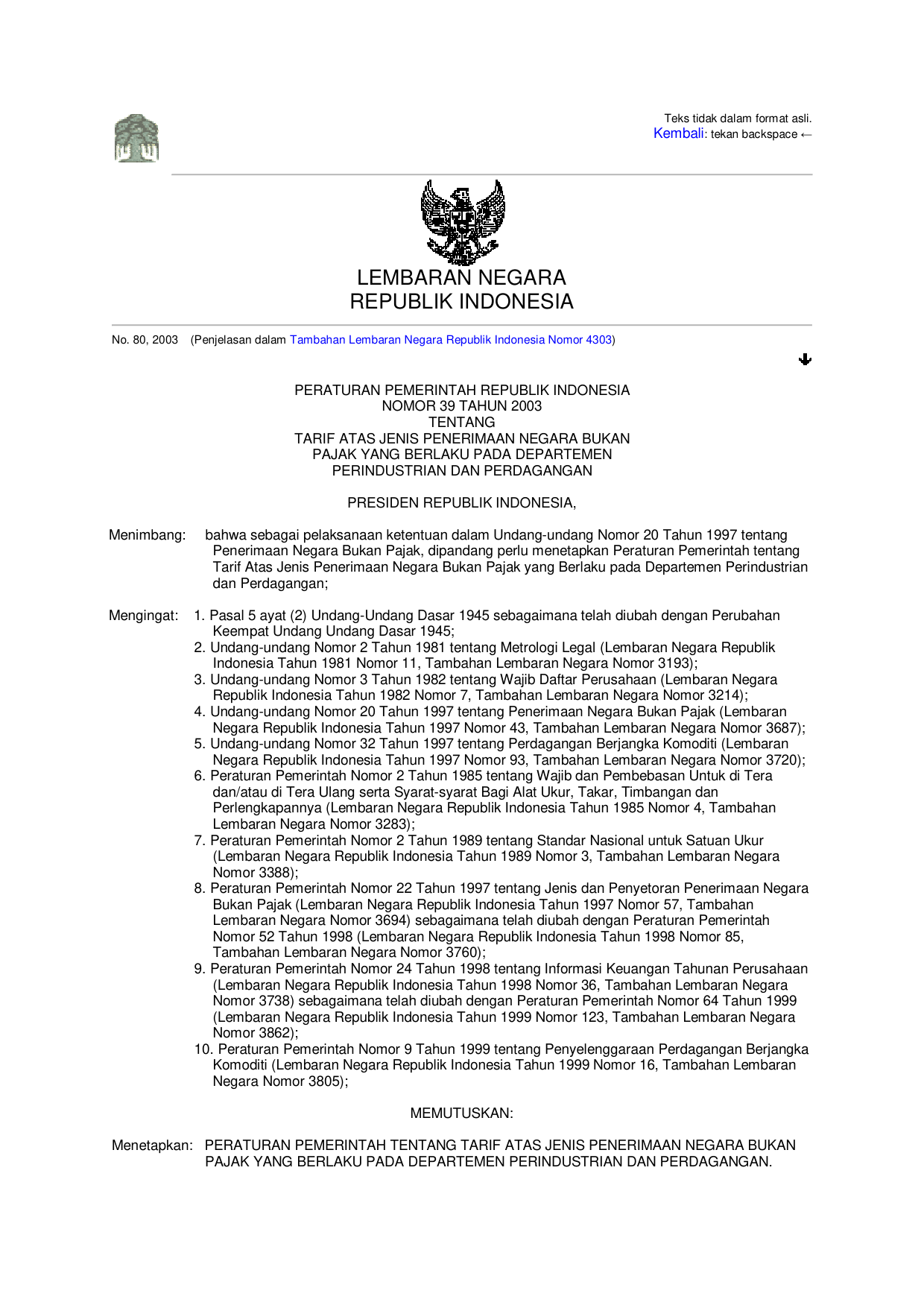 PP Nomor 38 Tahun 2003 | Peraturan Pemerintah Nomor 38 Tahun 2003 tentang PERUBAHAN ATAS PERATURAN PEMERINTAH NOMOR 146 TAHUN 2000 TENTANG IMPOR DAN/ATAU PENYERAHAN BARANG KENA PAJAK TERTENTU DAN/ATAU PENYERAHAN KENA PAJAK TERTENTU YANG DIBEBASKAN DARI PENGENAAN PAJAK PERTAMBAHAN NILAI
