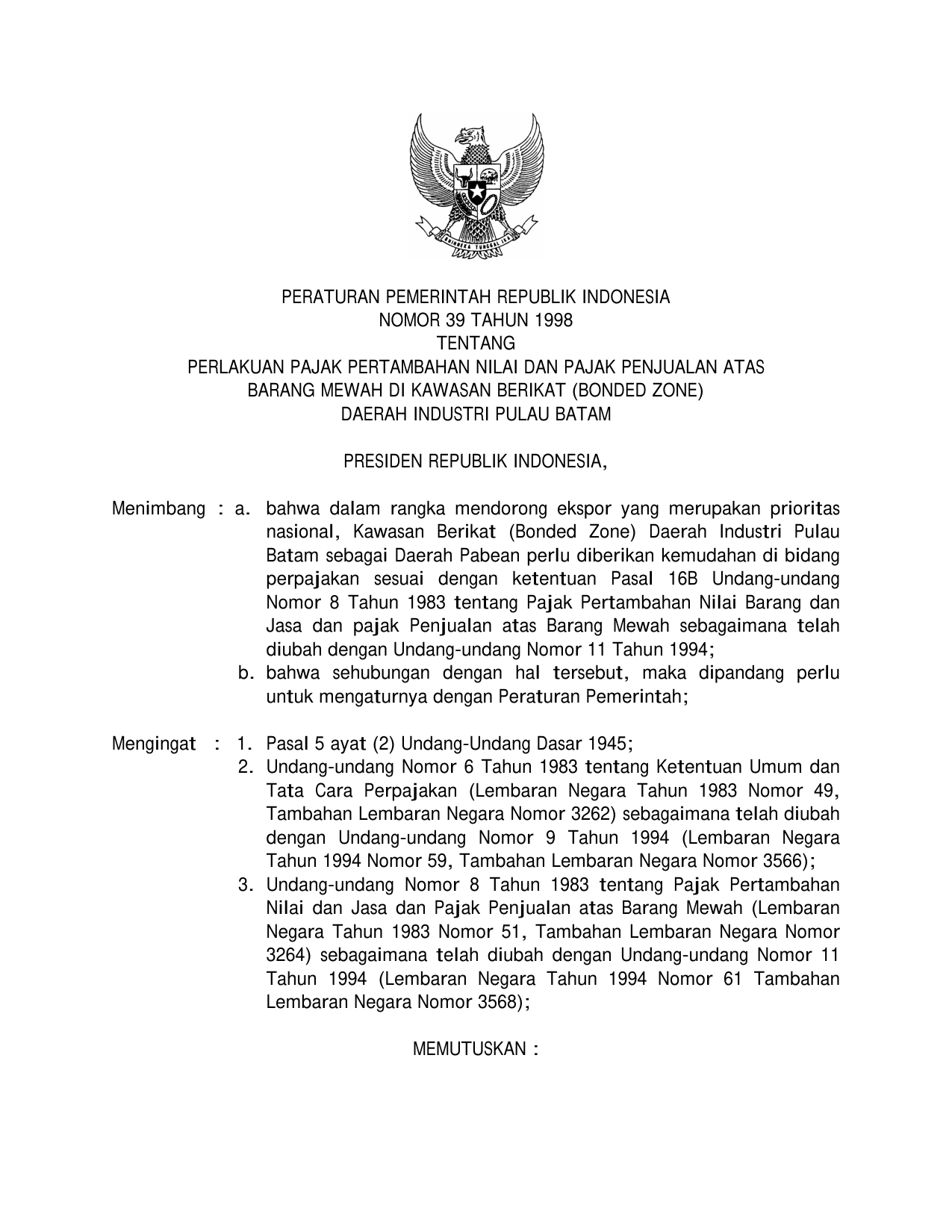 PP Nomor 39 Tahun 1998 | Peraturan Pemerintah Nomor 39 Tahun 1998 tentang PERLAKUAN PAJAK PERTAMBAHAN NILAI DAN PAJAK PENJUALAN ATAS BARANG MEWAH DI KAWASAN BERIKAT (BONDED ZONE) DAERAH INDUSTRI PULAU BATAM