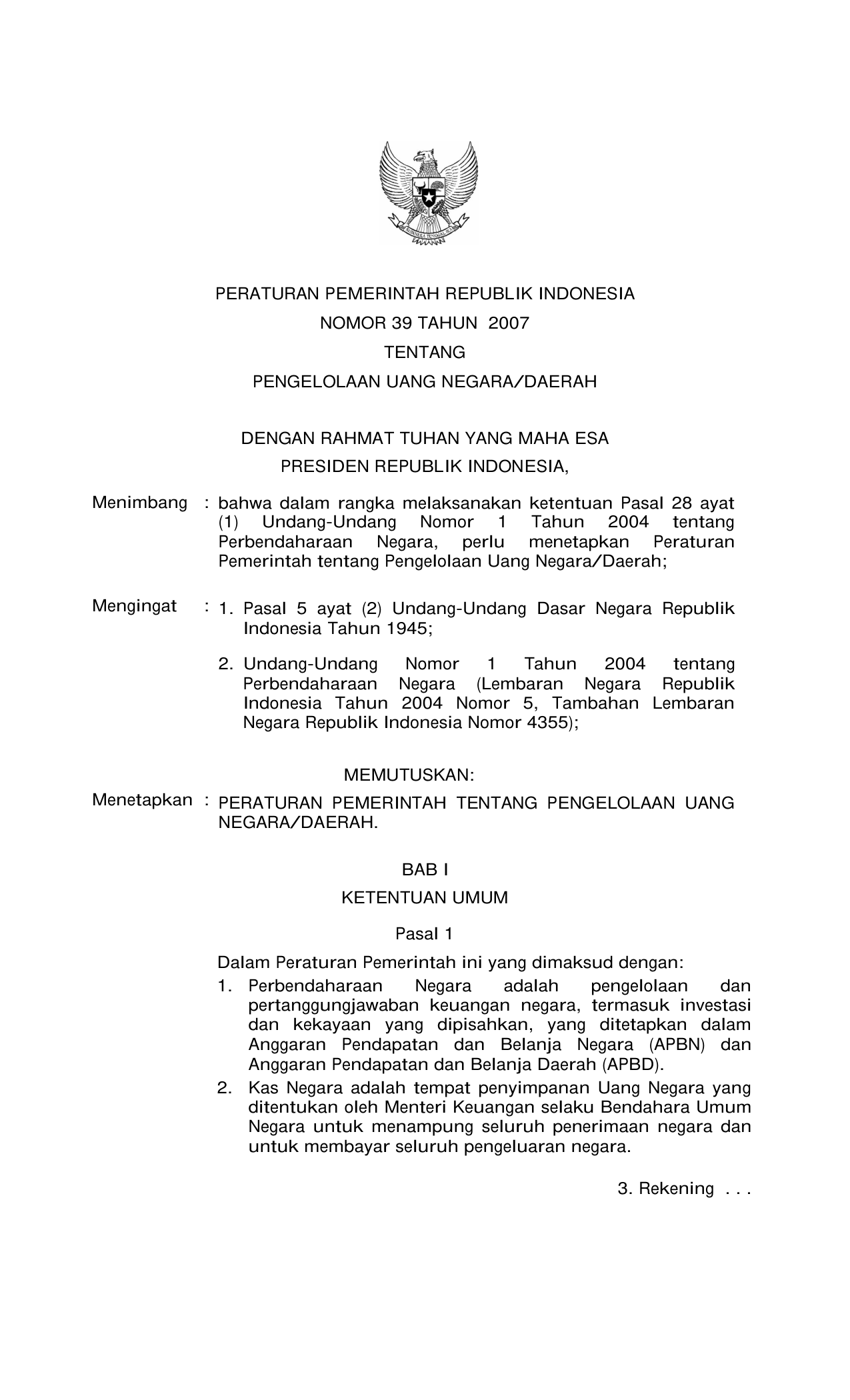 PP Nomor 39 Tahun 2007 | Peraturan Pemerintah Nomor 39 Tahun 2007 tentang PENGELOLAAN UANG NEGARA/DAERAH
