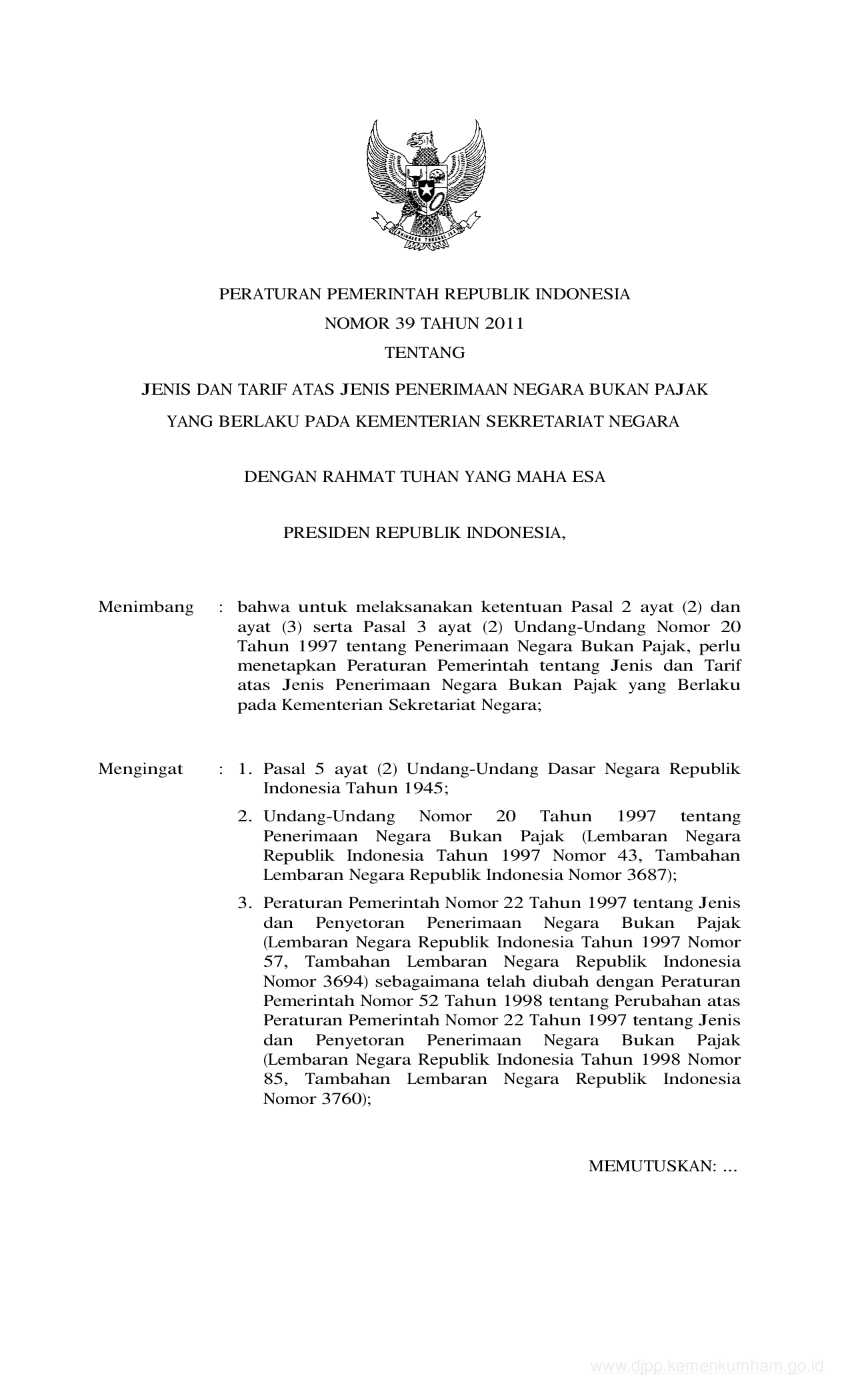 PP Nomor 39 Tahun 2011 | Peraturan Pemerintah Nomor 39 Tahun 2011 tentang JENIS DAN TARIF ATAS JENIS PENERIMAAN NEGARA BUKAN PAJAK YANG BERLAKU PADA KEMENTERIAN SEKRETARIAT NEGARA