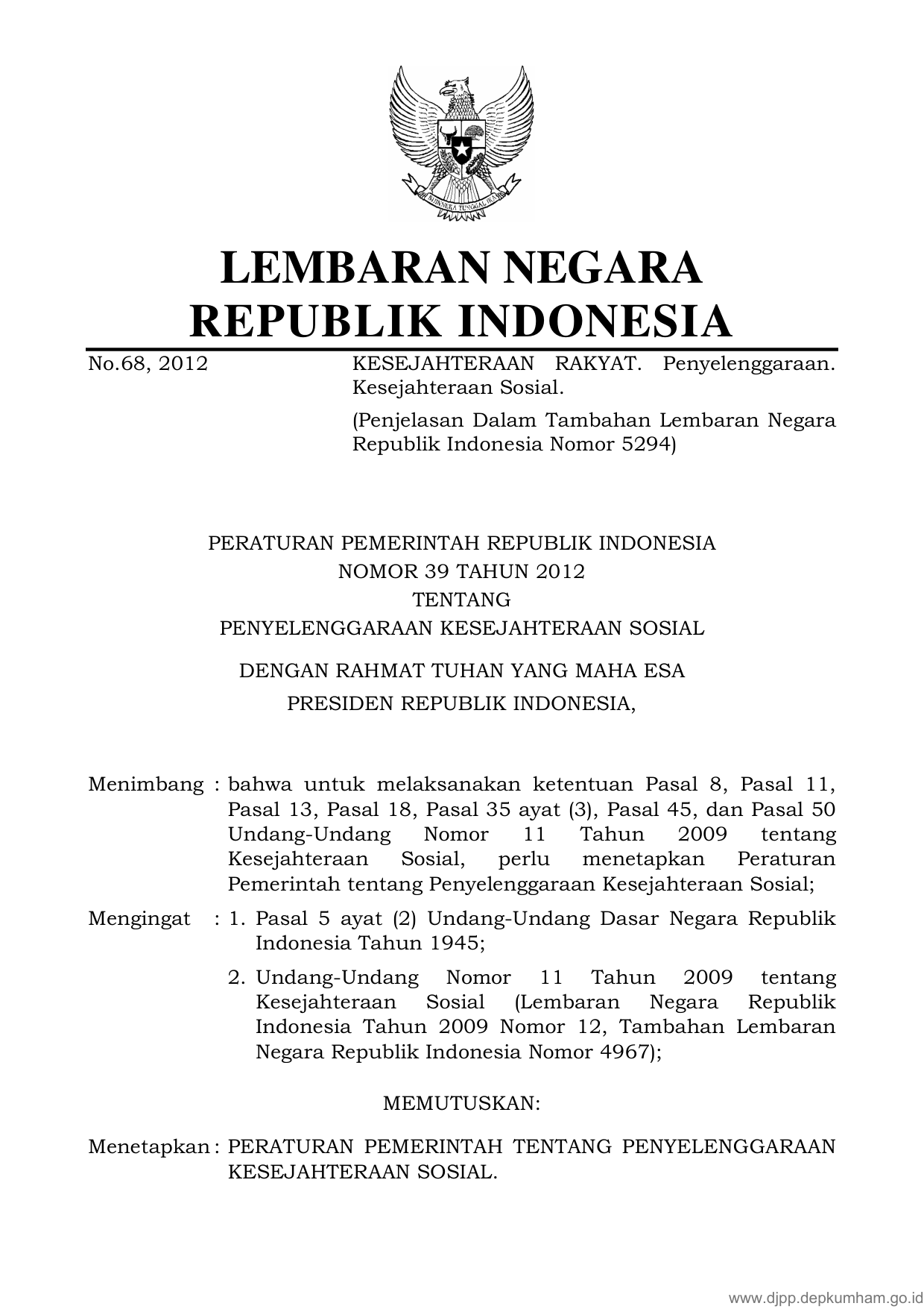 PP Nomor 39 Tahun 2012 | Peraturan Pemerintah Nomor 39 Tahun 2012 tentang PENYELENGGARAAN KESEJAHTERAAN SOSIAL