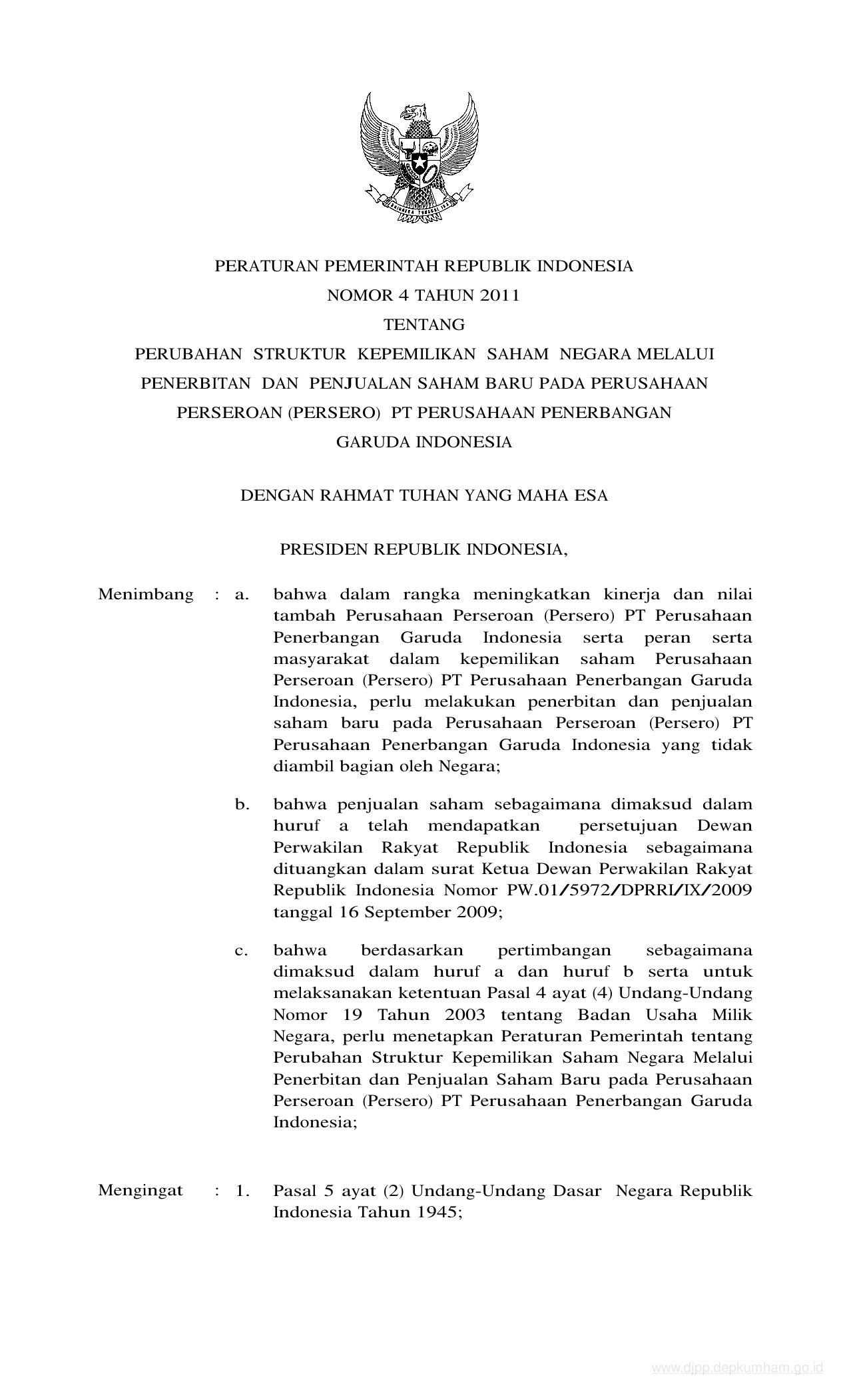 PP Nomor 4 Tahun 2011 | Peraturan Pemerintah Nomor 4 Tahun 2011 tentang PERUBAHAN STRUKTUR KEPEMILIKAN SAHAM NEGARA MELALUI PENERBITAN DAN PENJUALAN SAHAM BARU PADA PERUSAHAAN PERSEROAN (PERSERO) PT PERUSAHAAN PENERBANGAN GARUDA INDONESIA