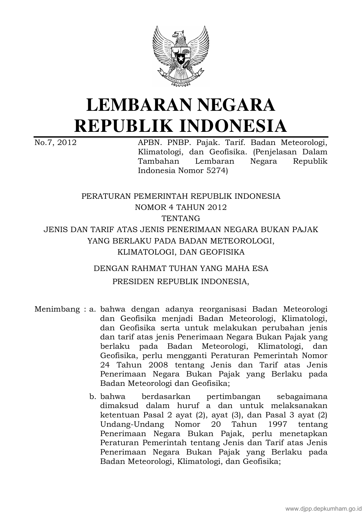 PP Nomor 4 Tahun 2012 | Peraturan Pemerintah Nomor 4 Tahun 2012 tentang JENIS DAN TARIF ATAS JENIS PENERIMAAN NEGARA BUKAN PAJAK YANG BERLAKU PADA BADAN METEOROLOGI, KLIMATOLOGI, DAN GEOFISIKA