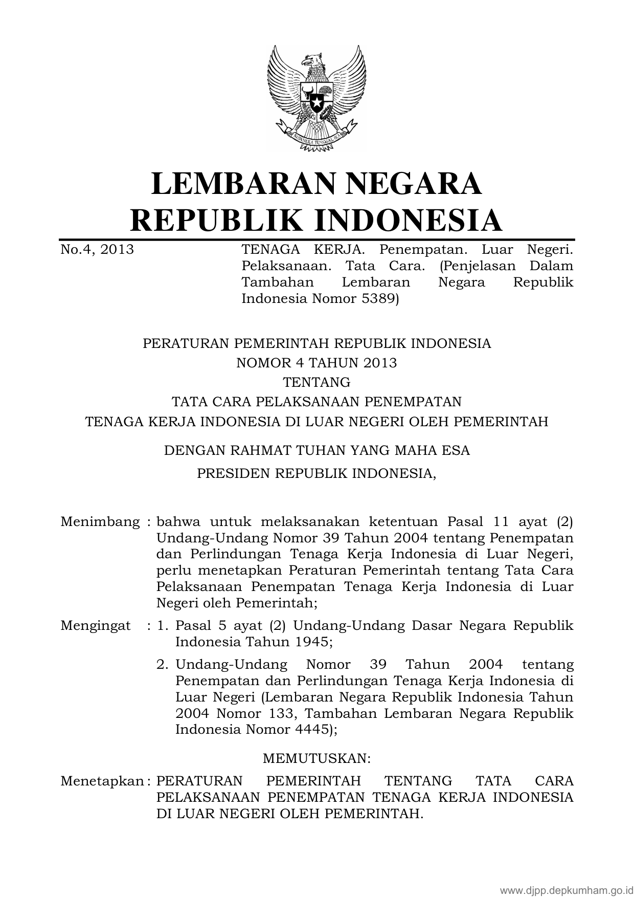 PP Nomor 4 Tahun 2013 | Peraturan Pemerintah Nomor 4 Tahun 2013 tentang TATA CARA PELAKSANAAN PENEMPATAN TENAGA KERJA INDONESIA DI LUAR NEGERI OLEH PEMERINTAH