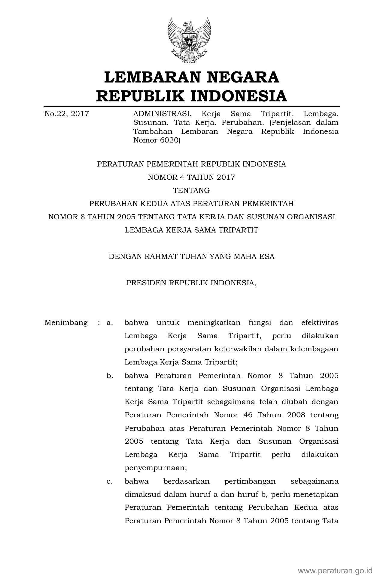 PP Nomor 4 Tahun 2017 | Peraturan Pemerintah Nomor 4 Tahun 2017 tentang Perubahan Kedua Atas Peraturan Pemerintah Nomor 8 Tahun 2005 Tentang Tata Kerja Dan Susunan Organisasi Lembaga Kerja Sama Tripartit