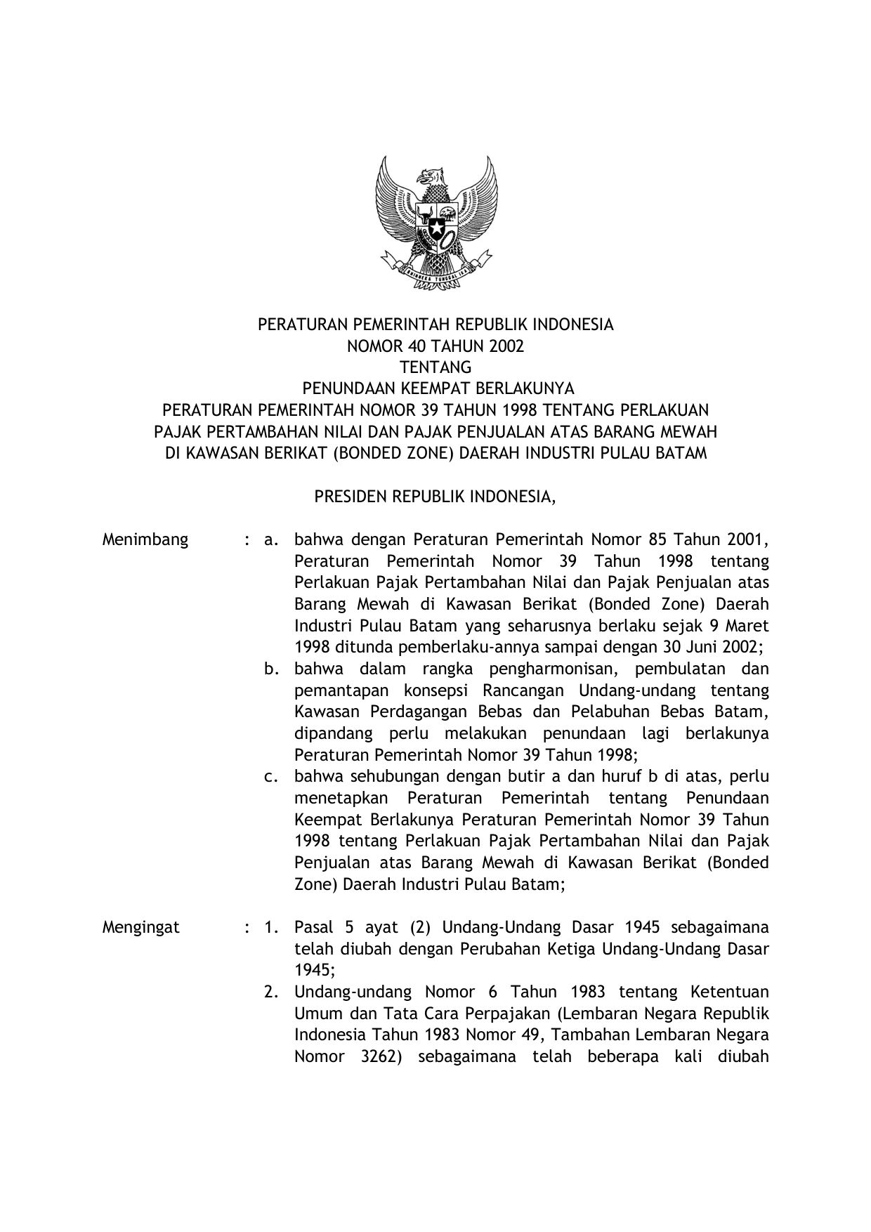 PP Nomor 40 Tahun 2002 | Peraturan Pemerintah Nomor 40 Tahun 2002 tentang PENUNDAAN KEEMPAT BERLAKUNYA PP 39-1998 TENTANG PERLAKUAN PAJAK PERTAMBAHAN NILAI ATAS BARANG MEWAH DI KAWASAN BERIKAT (BONDED ZONE) DAERAH INDUSTRI PULAU BATAM