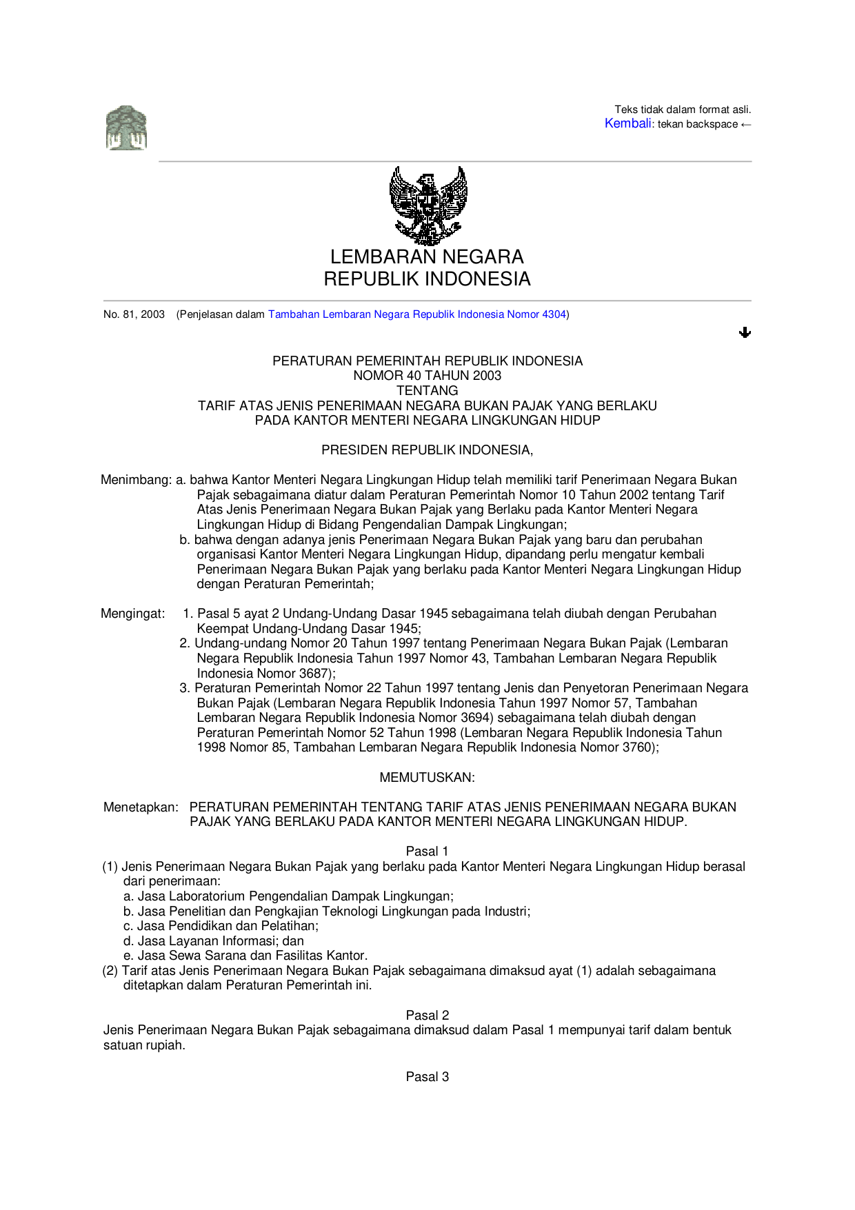 PP Nomor 40 Tahun 2003 | Peraturan Pemerintah Nomor 40 Tahun 2003 tentang TARIF ATAS JENIS PENERIMAAN NEGARA BUKAN PAJAK YANG BERLAKU PADA KANTOR MENTERI NEGARA LINGKUNGAN HIDUP