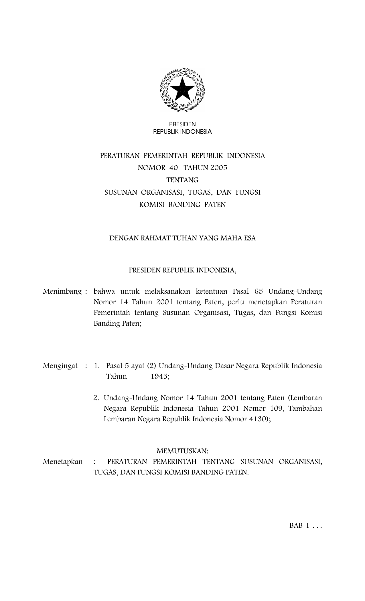 PP Nomor 40 Tahun 2005 | Peraturan Pemerintah Nomor 40 Tahun 2005 tentang SUSUNAN ORGANISASI, TUGAS, DAN FUNGSI KOMISI BANDING PATEN