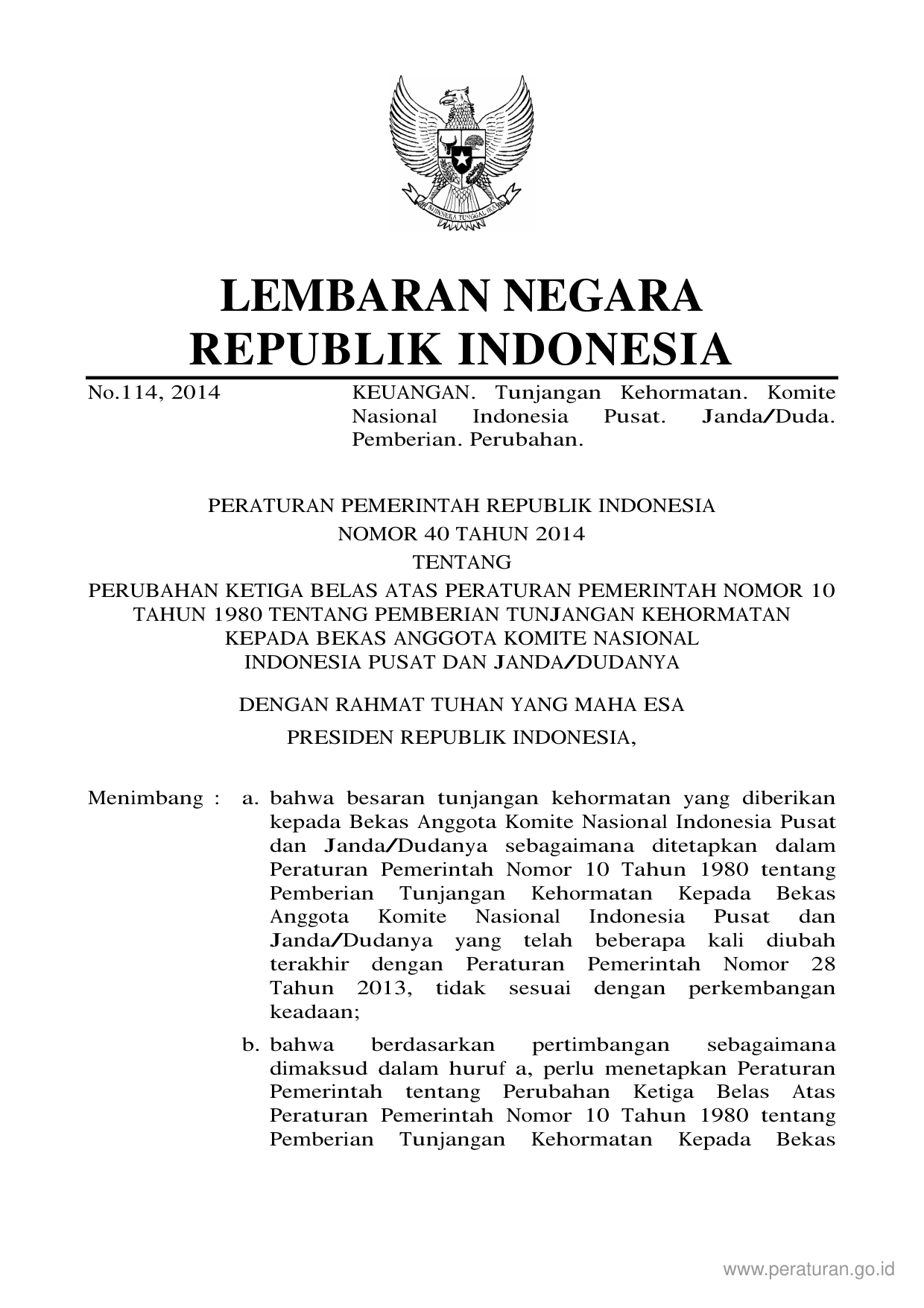 PP Nomor 40 Tahun 2014 | Peraturan Pemerintah Nomor 40 Tahun 2014 tentang PERUBAHAN KETIGA BELAS ATAS PERATURAN PEMERINTAH NOMOR 10 TAHUN 1980 TENTANG PEMBERIAN TUNJANGAN KEHORMATAN KEPADA BEKAS ANGGOTA KOMITE NASIONALINDONESIA PUSAT DAN JANDA/DUDANYA