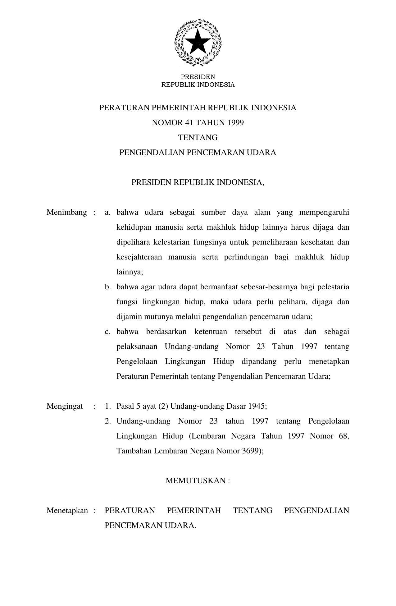 PP Nomor 41 Tahun 1999 | Peraturan Pemerintah Nomor 41 Tahun 1999 tentang PENGENDALIAN PENCEMARAN UDARA