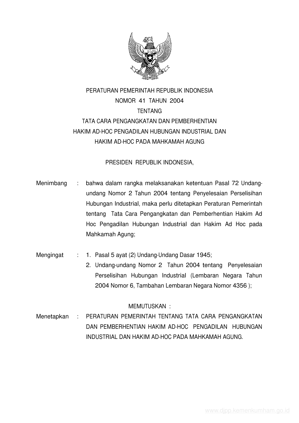 PP Nomor 41 Tahun 2004 | Peraturan Pemerintah Nomor 41 Tahun 2004 tentang TATA CARA PENGANGKATAN DAN PEMBERHENTIAN HAKIM AD-HOC PENGADILAN HUBUNGAN INDUSTRIAL DAN HAKIM AD-HOC PADA MAHKAMAH AGUNG