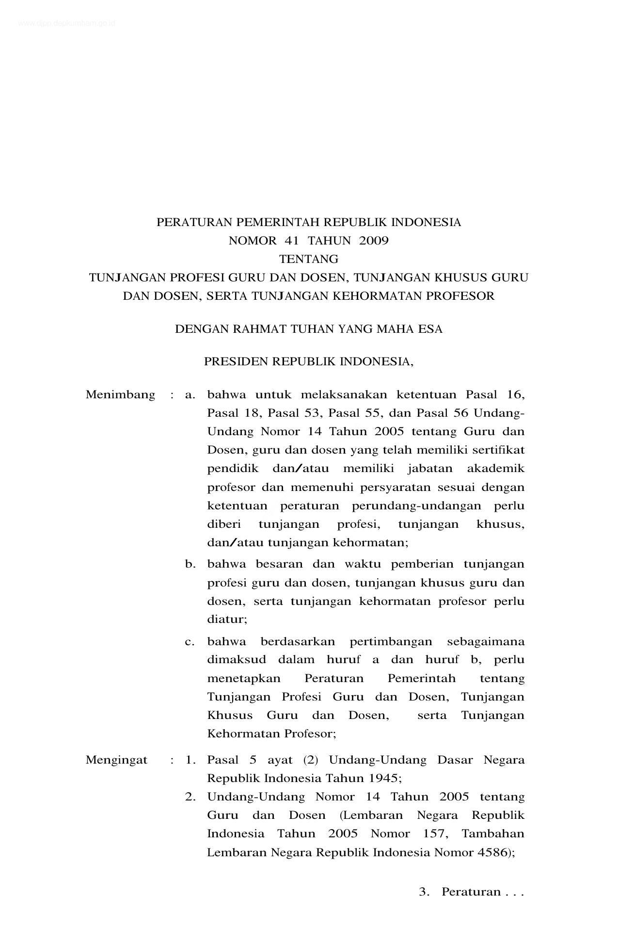 PP Nomor 41 Tahun 2009 | Peraturan Pemerintah Nomor 41 Tahun 2009 tentang TUNJANGAN PROFESI GURU DAN DOSEN, TUNJANGAN KHUSUS GURU DAN DOSEN, SERTA TUNJANGAN KEHORMATAN PROFESOR