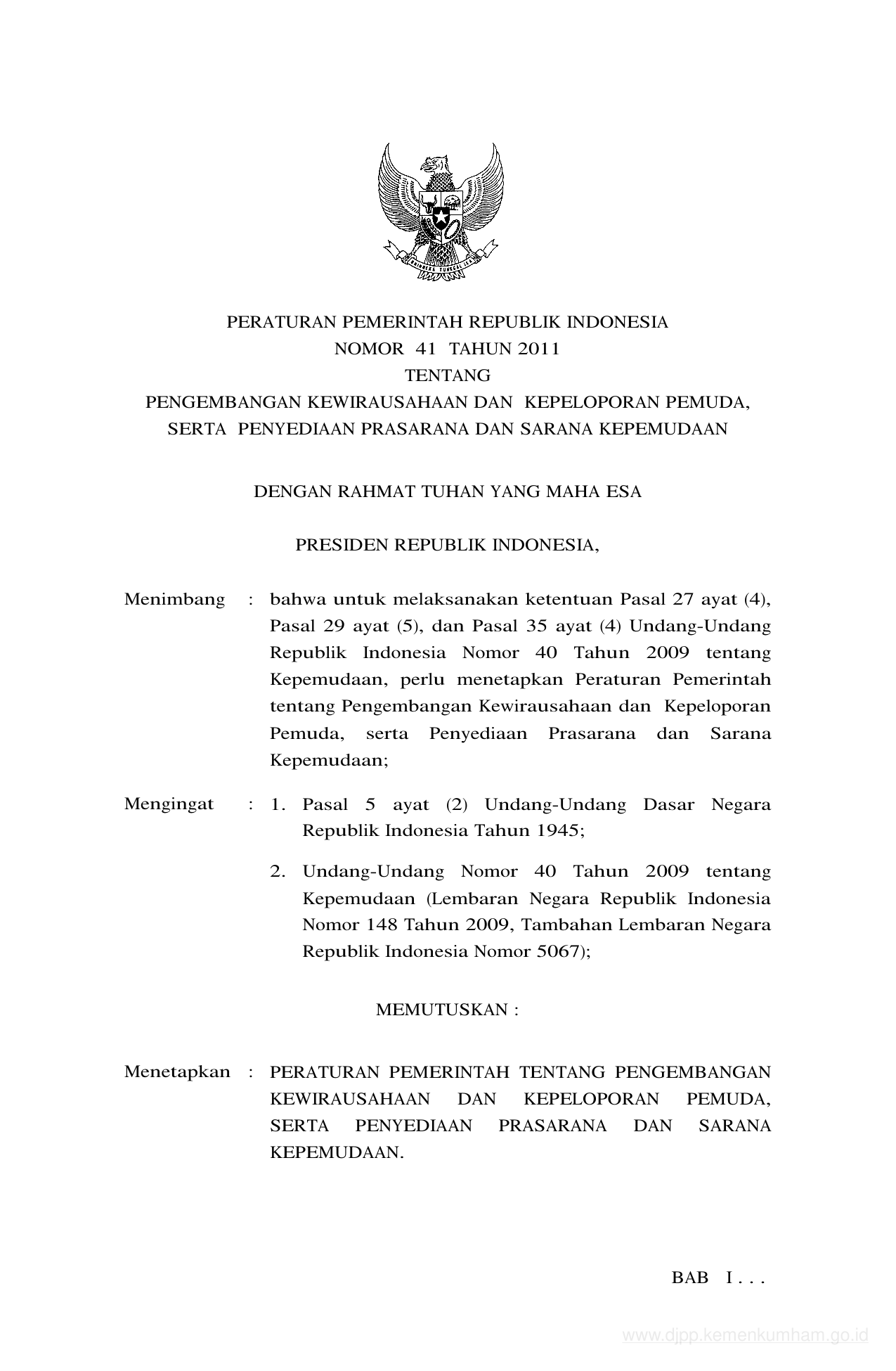 PP Nomor 41 Tahun 2011 | Peraturan Pemerintah Nomor 41 Tahun 2011 tentang PENGEMBANGAN KEWIRAUSAHAAN DAN KEPELOPORAN PEMUDA, SERTA PENYEDIAAN PRASARANA DAN SARANA KEPEMUDAAN