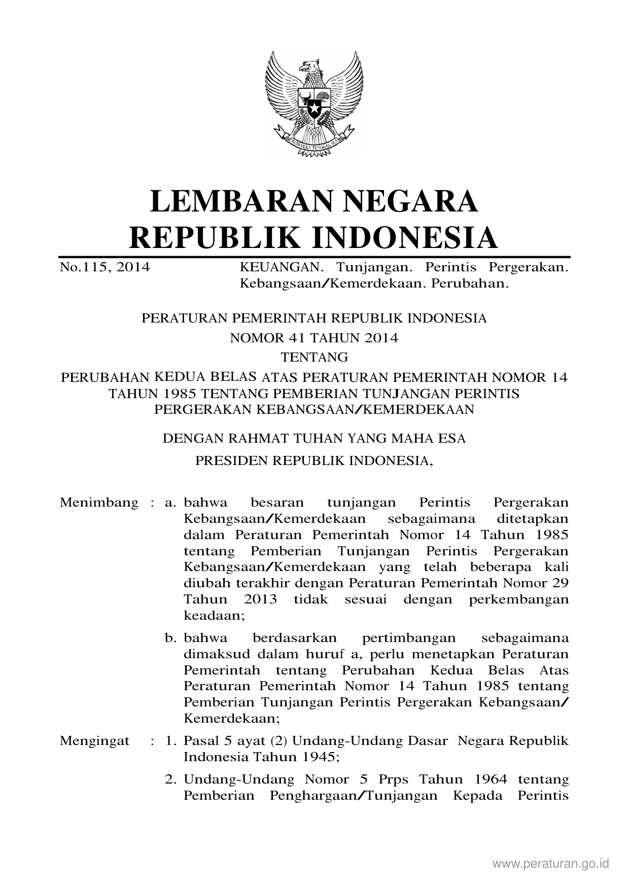 PP Nomor 41 Tahun 2014 | Peraturan Pemerintah Nomor 41 Tahun 2014 tentang PERUBAHAN KEDUA BELAS ATAS PERATURAN PEMERINTAH NOMOR 14 TAHUN 1985 TENTANG PEMBERIAN TUNJANGAN PERINTIS PERGERAKAN KEBANGSAAN/KEMERDEKAAN