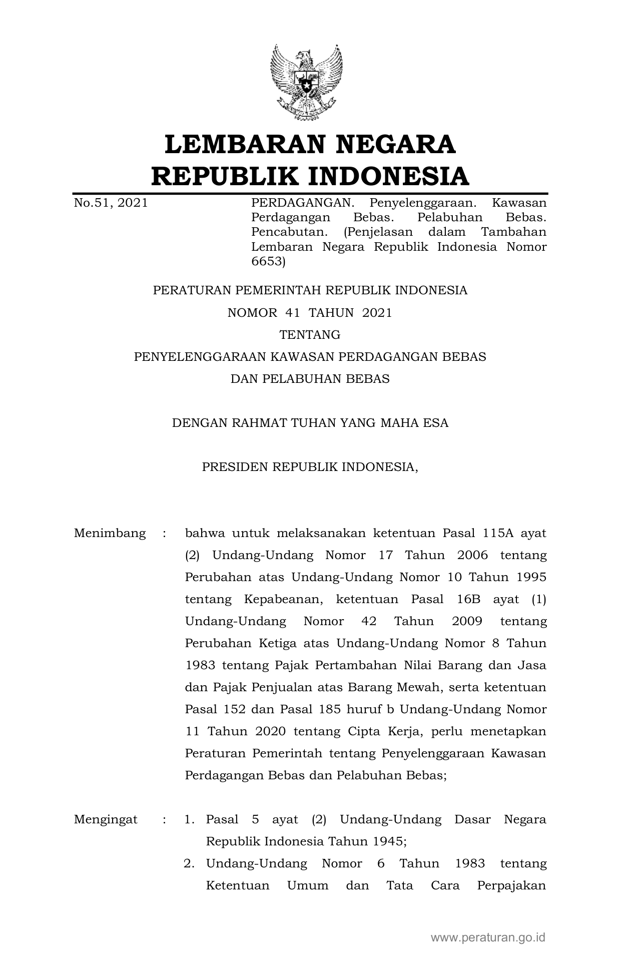 PP Nomor 41 Tahun 2021 | Peraturan Pemerintah Nomor 41 Tahun 2021 tentang PENYELENGGARAAN KAWASAN PERDAGANGAN BEBAS DAN PELABUHAN BEBAS