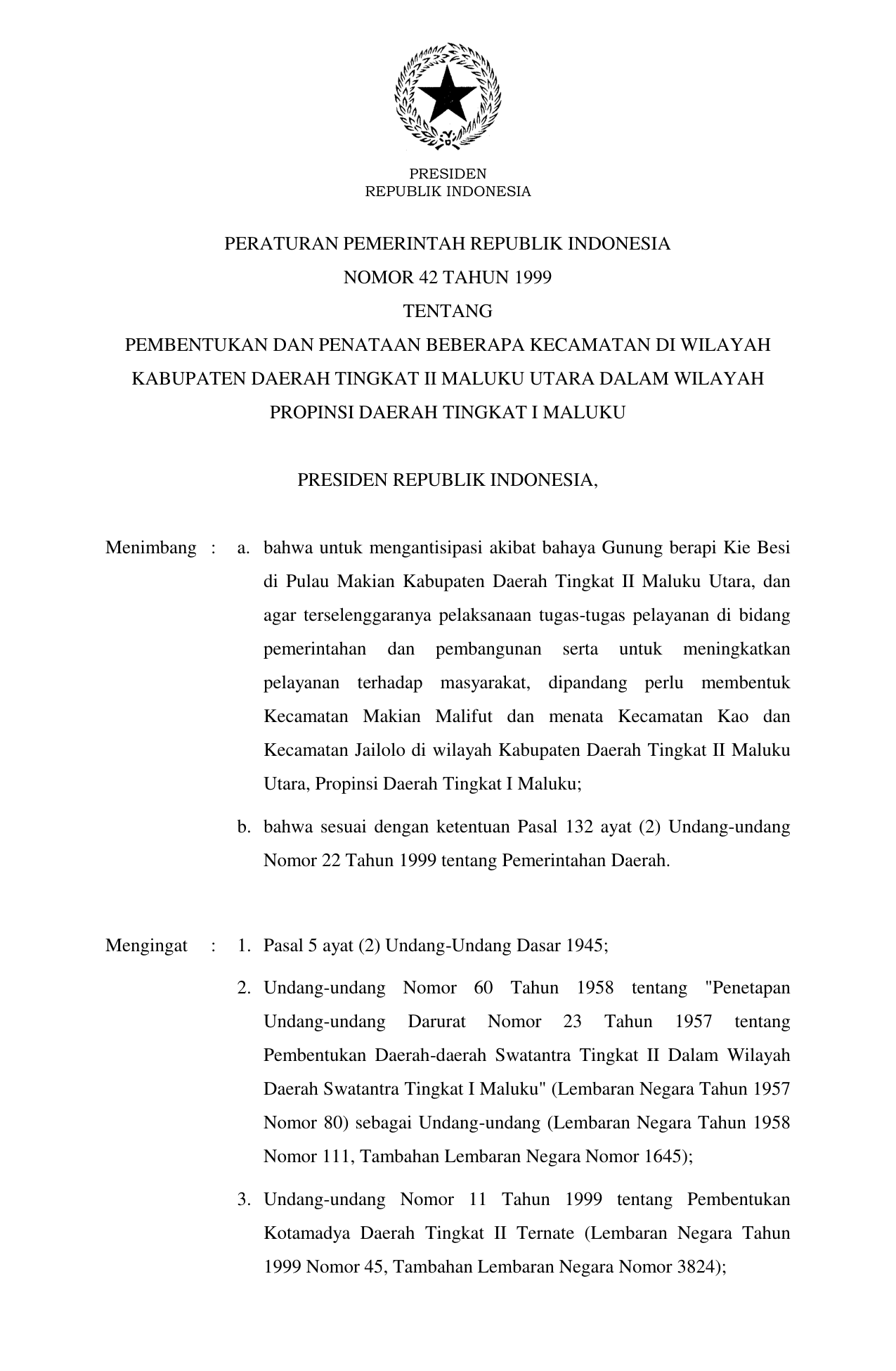PP Nomor 42 Tahun 1999 | Peraturan Pemerintah Nomor 42 Tahun 1999 tentang PEMBENTUKAN DAN PENATAAN BEBERAPA KECAMATAN DI WILAYAH KABUPATEN DATI II MALUKU UTARA DALAM WILAYAH PROPINSI DATI I MALUKU