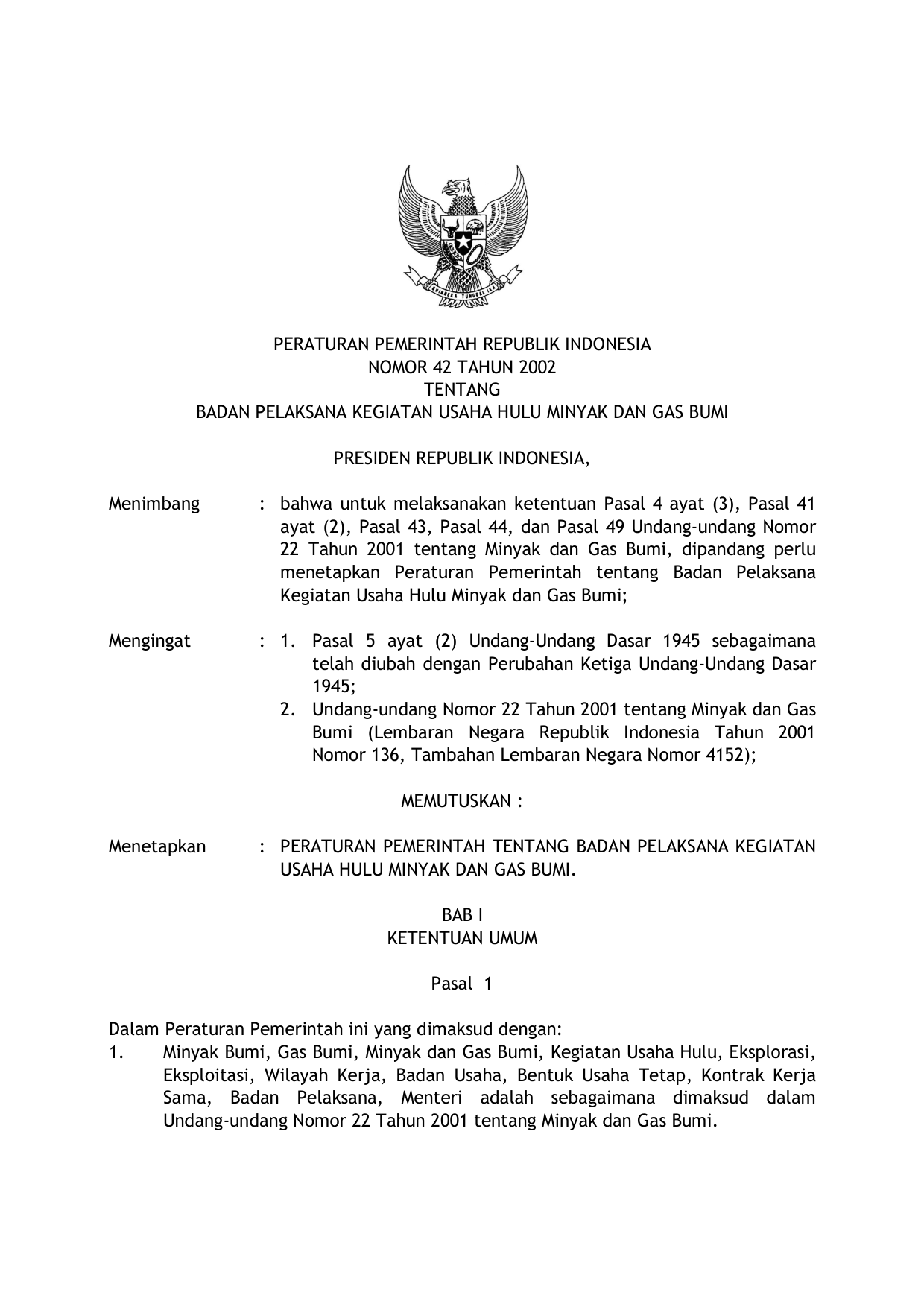 PP Nomor 42 Tahun 2002 | Peraturan Pemerintah Nomor 42 Tahun 2002 tentang BADAN PELAKSANA KEGIATAN USAHA HULU MINYAK DAN GAS BUMI