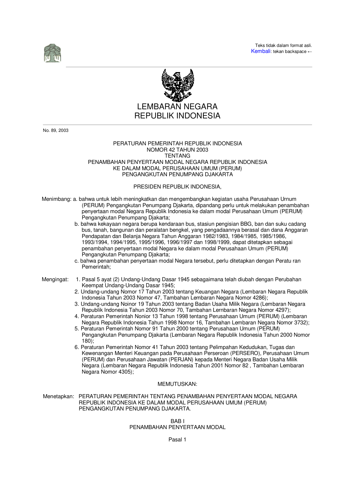 PP Nomor 42 Tahun 2003 | Peraturan Pemerintah Nomor 42 Tahun 2003 tentang PENAMBAHAN PENYERTAAN MODAL NEGARA RI KE DALAM MODAL PERUSAHAAN UMUM (PERUM) PENGANGKUTAN PENUMPANG DJAKARTA