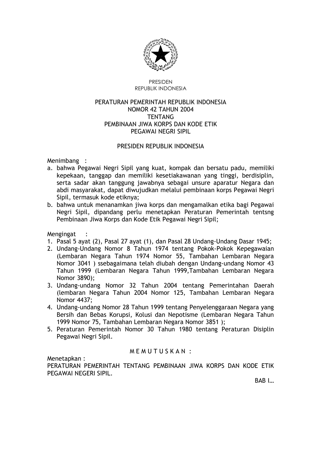 PP Nomor 42 Tahun 2004 | Peraturan Pemerintah Nomor 42 Tahun 2004 tentang PEMBINAAN JIWA KORPS DAN KODE ETIK PEGAWAI NEGERI SIPIL