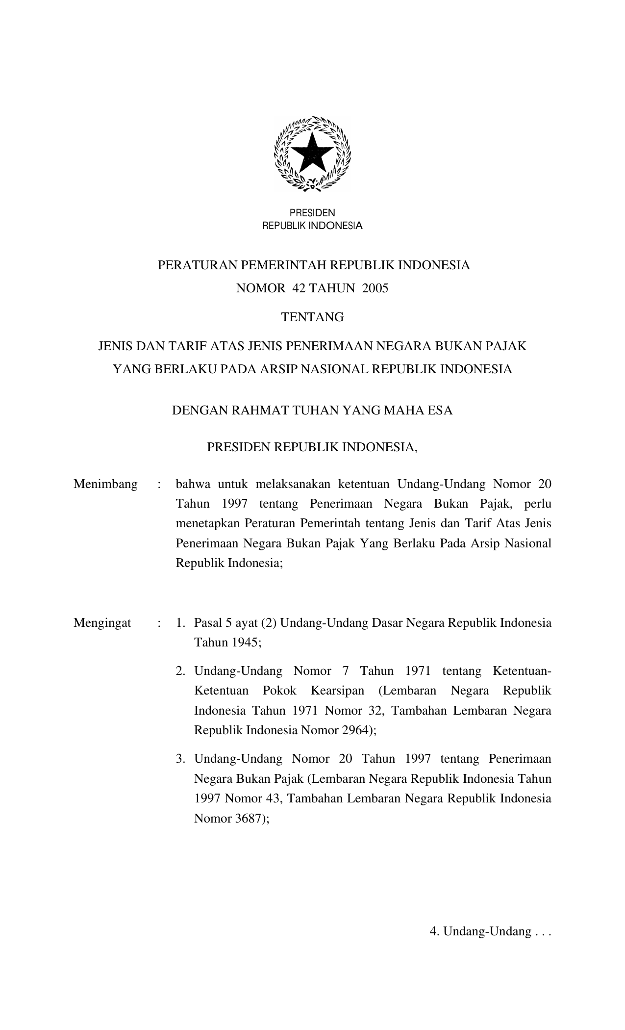 PP Nomor 42 Tahun 2005 | Peraturan Pemerintah Nomor 42 Tahun 2005 tentang JENIS DAN TARIF ATAS JENIS PENERIMAAN NEGARA BUKAN PAJAK YANG BERLAKU PADA ARSIP NASIONAL RI