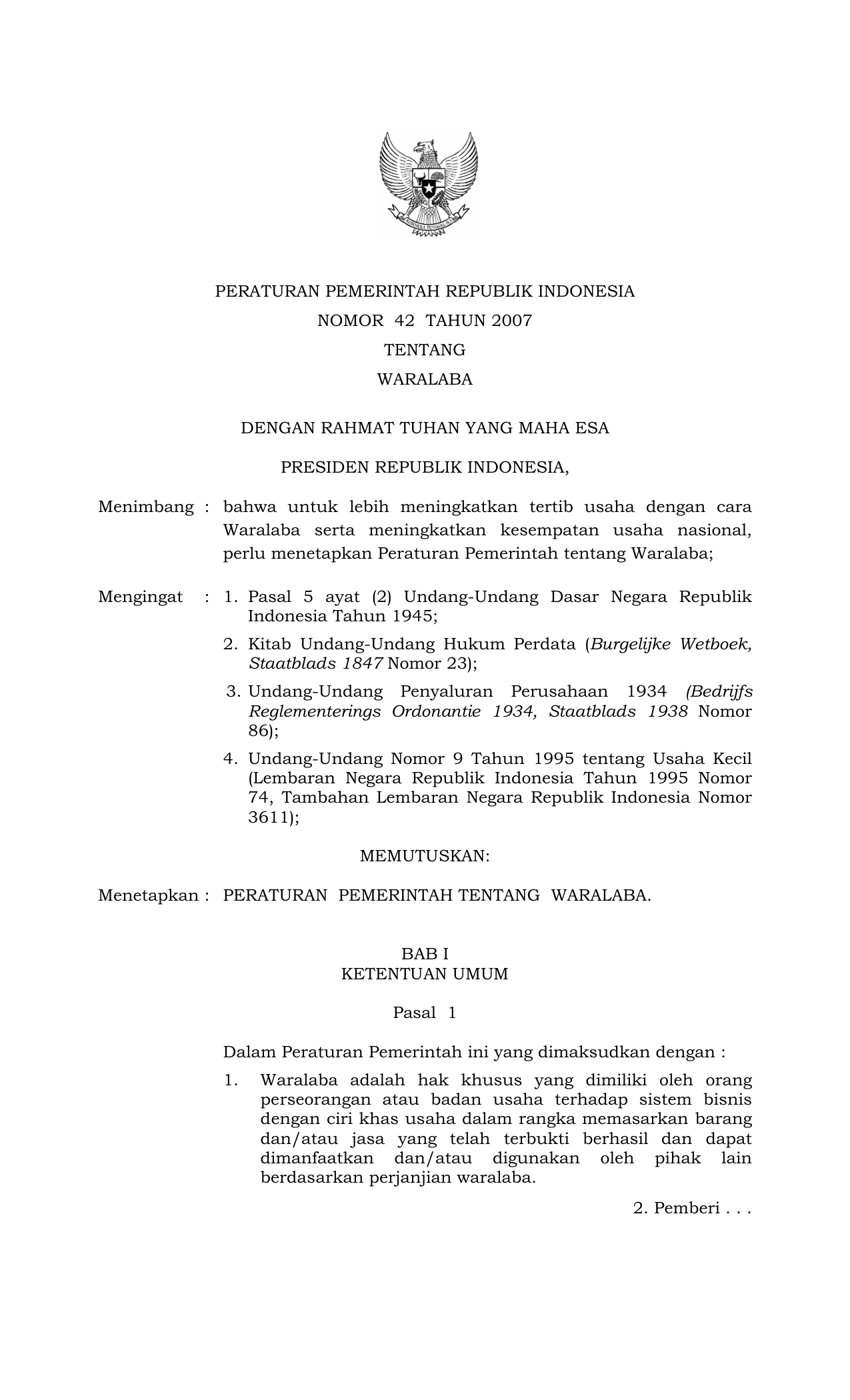 PP Nomor 42 Tahun 2007 | Peraturan Pemerintah Nomor 42 Tahun 2007 tentang WARALABA